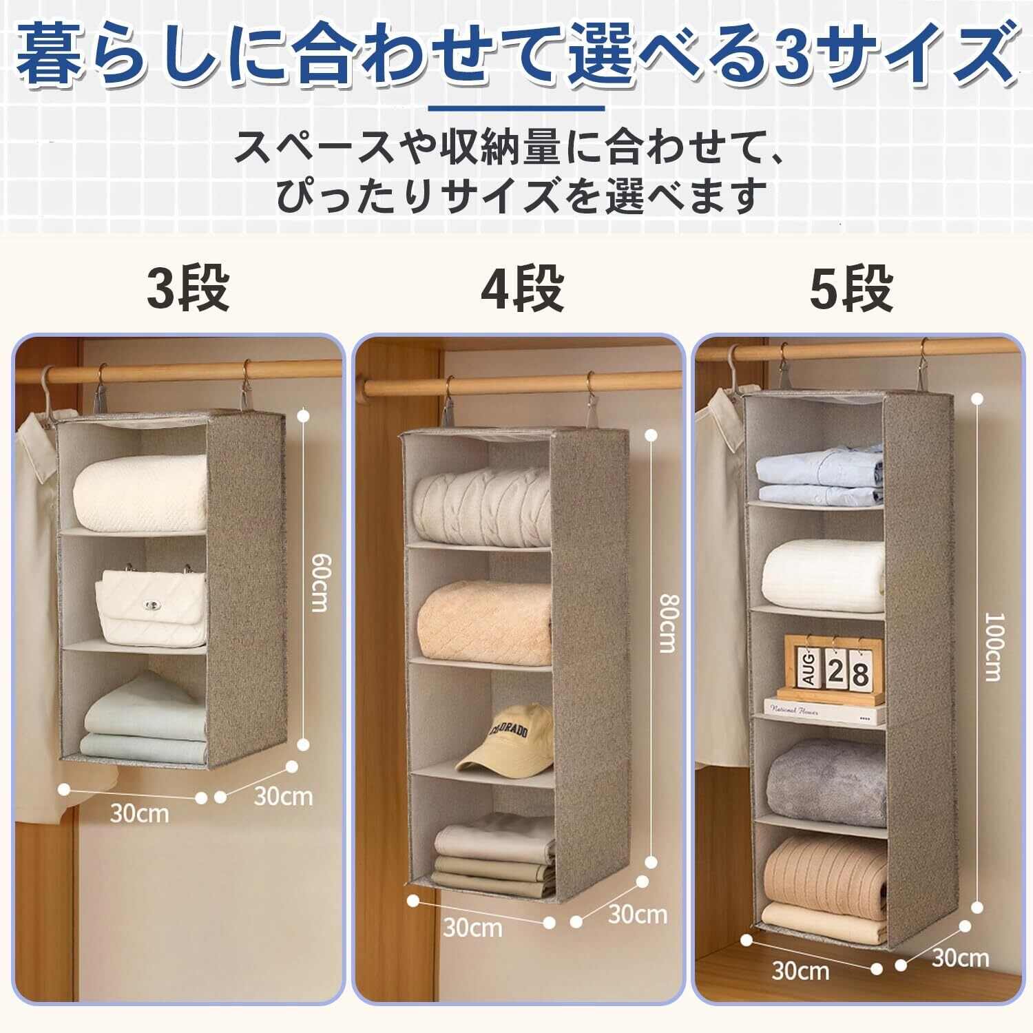 【臭いゼロ・開封後すぐ使える】独自の無臭不織布を使用。開封してそのままクローゼット・押入れ・脱衣所に設置できます。Tシャツ・セーター・タオル・バッグなど幅広い用途に対応。4段設計でクローゼットの縦空間をフル活用。