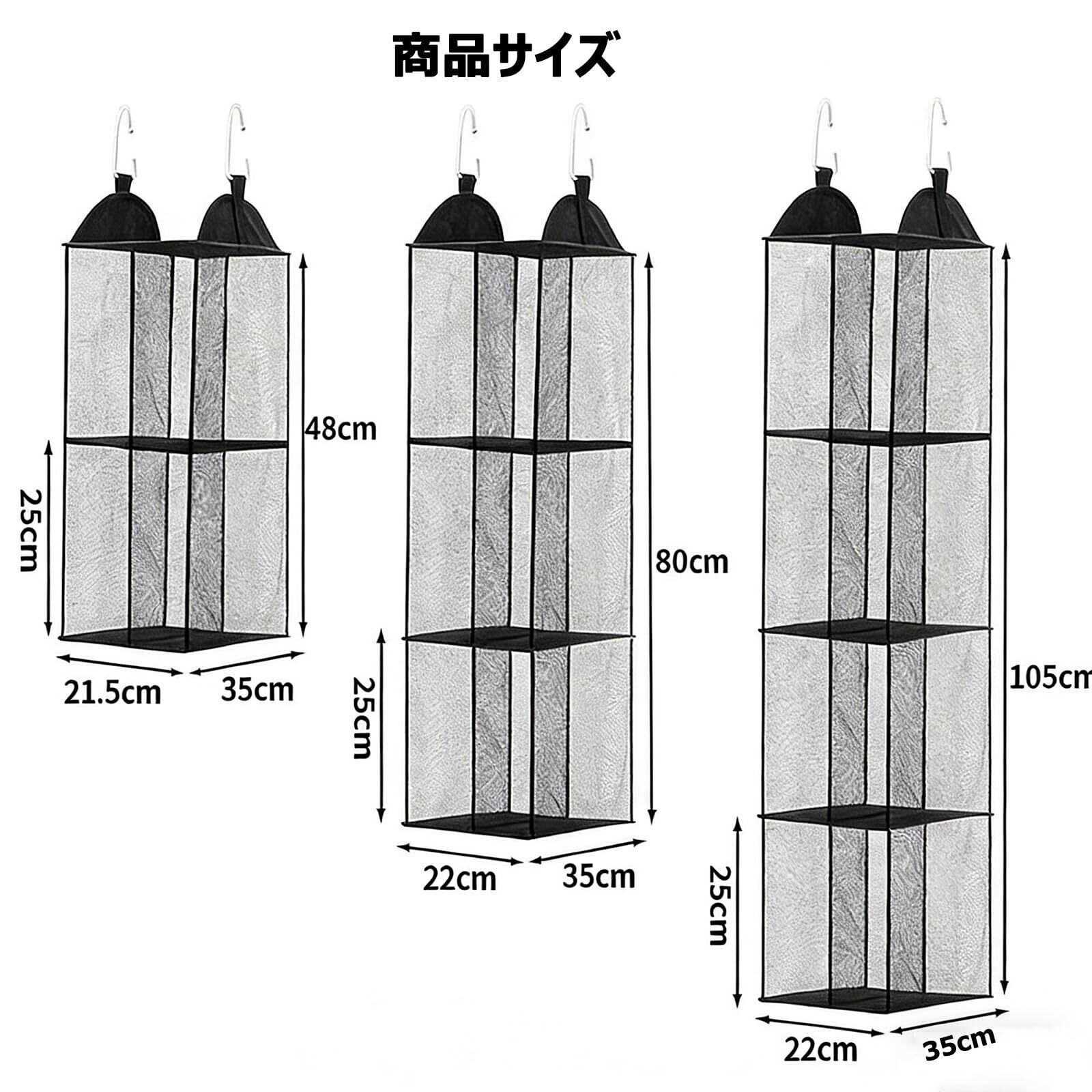 製品仕様:吊り下げ収納 バッグ収納ラック 4段展開 サイズ:約22×35×105cm、3段展開 サイズ:22×35×80cm、2段展開 サイズ:21.5×35×48cm。収納サイズ:22×35x2cm。