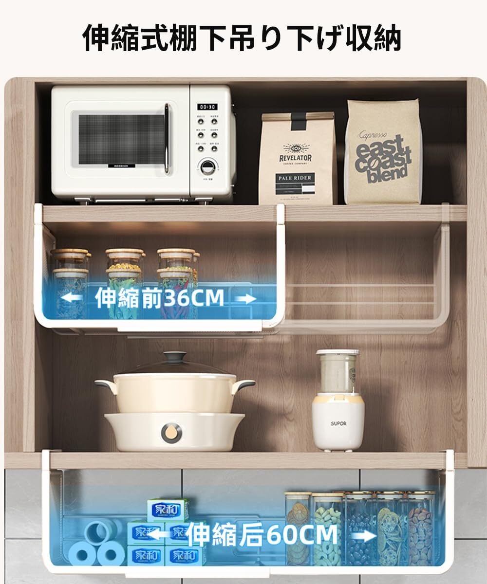 【長さ調節可能】伸縮式吊り下げ棚の長さは、お好みに合わせて調整できます。伸縮範囲は36から60センチメートルで、さまざまなサイズの収納スペースに対応しています。