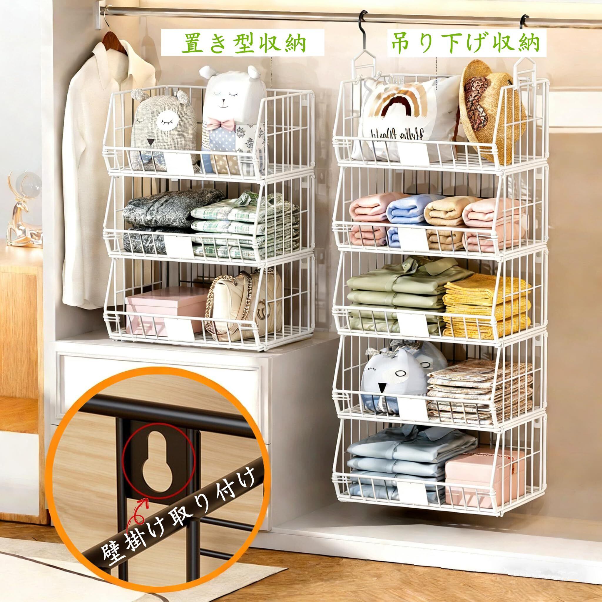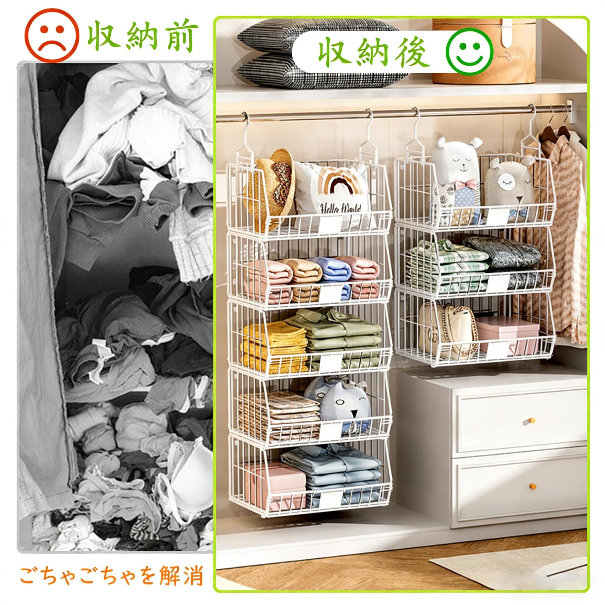 【3通りの設置方法で空間を有効活用】縦置きスタッキングで限られたスペースを有効活用できます。クローゼットに吊り下げたり、棚やカウンターに置いたり、壁に取り付けることも可能。分類収納で収納効率が向上し、暮らしを快適にサポートします。