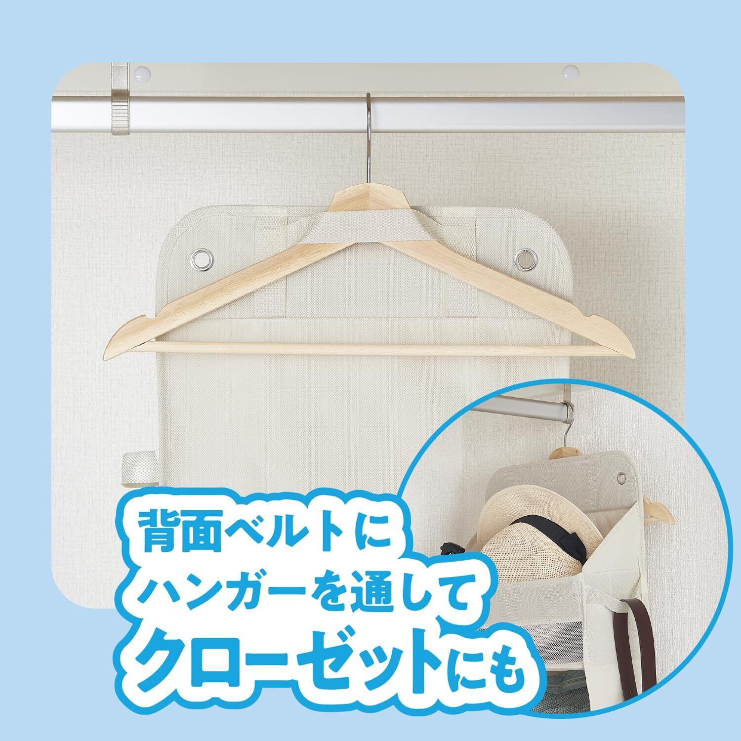 【ベルト付き】サイドにマフラーやストール、散歩用リードが掛けられるベルト付き。後ろ面にハンガーベルトが付いていて、ハンガーを通すとクローゼットにも掛けられます。