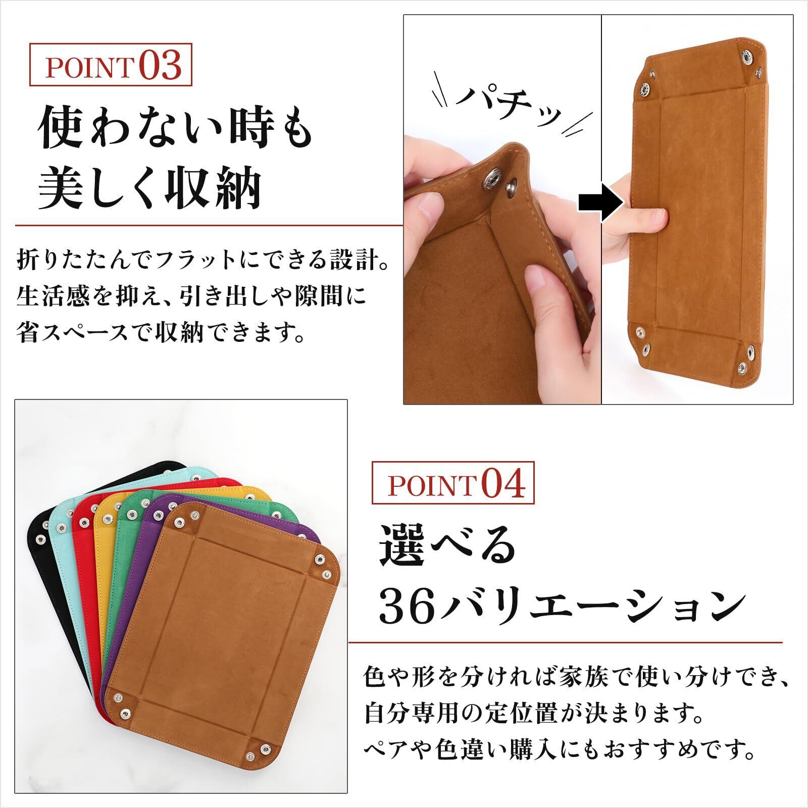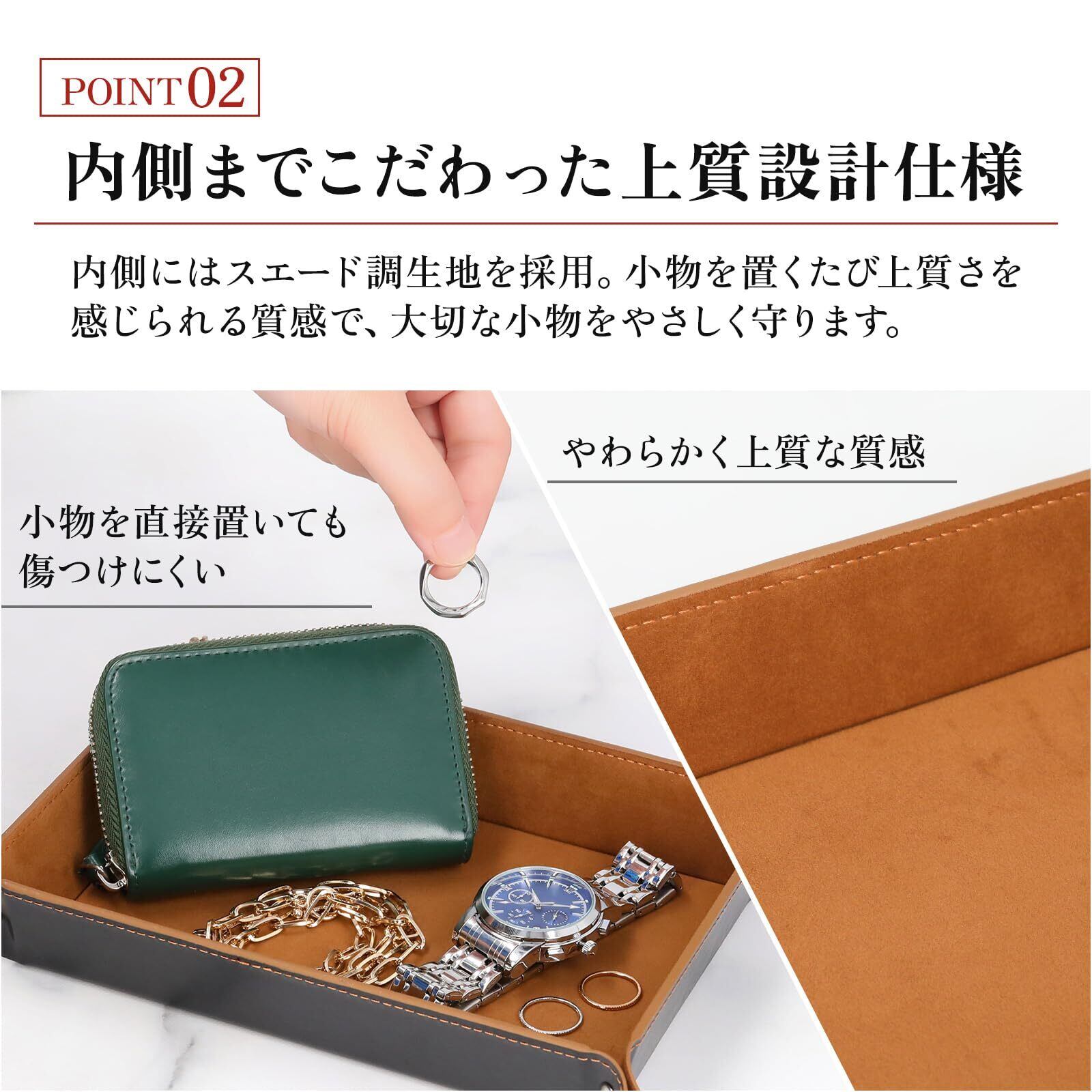 内側にはスエード調生地を採用し、小物をやさしく保護。直接置いても傷つきにくく、指輪や時計、サングラスなどの大切なアイテムも安心して収納できます。