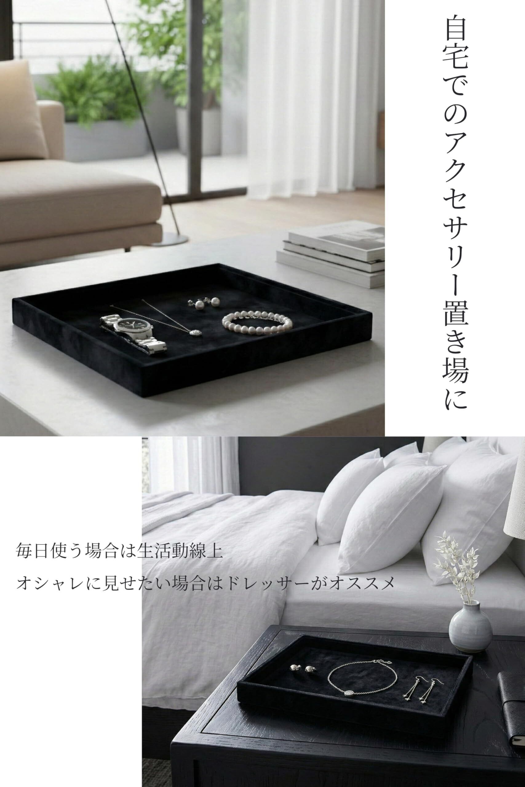 【どこでも使える多機能性】このジュエリートレーは、業務用としてだけでなく、家庭でのアクセサリー収納や整理にも活躍します。トレーのサイズやデザインは、多様なシーンにマッチするよう設計されています。軽量で取り扱いやすいため、どこでも快適にご使用いただけます。