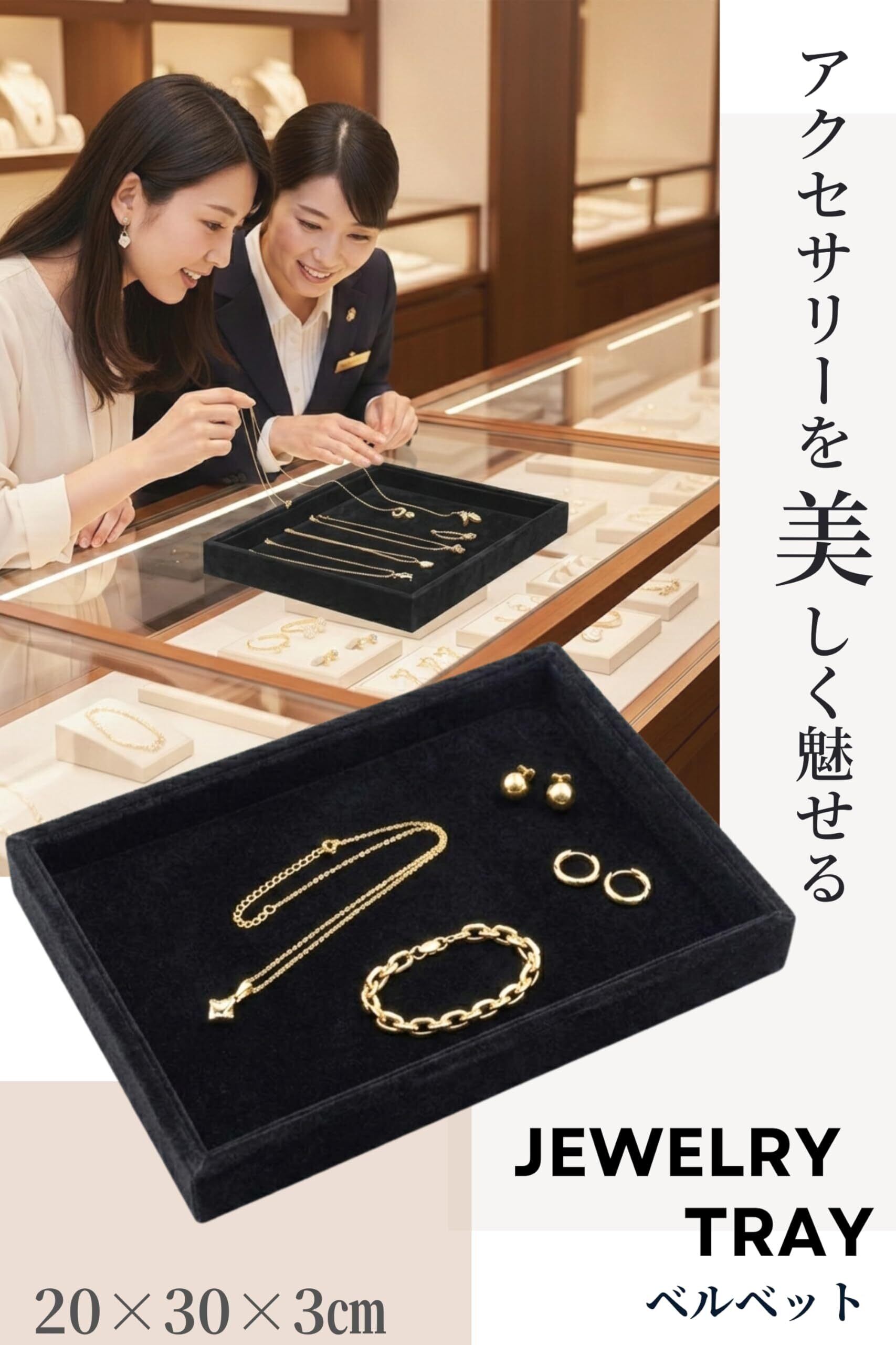 【接客業務をサポートする洗練デザイン】シンプルでスタイリッシュなジュエリートレイは、接客や商品展示の場面で高いプロフェッショナル感を演出します。業務用トレーとして、指輪や宝石を扱うショップに最適で、特別な瞬間をさらに引き立てます。