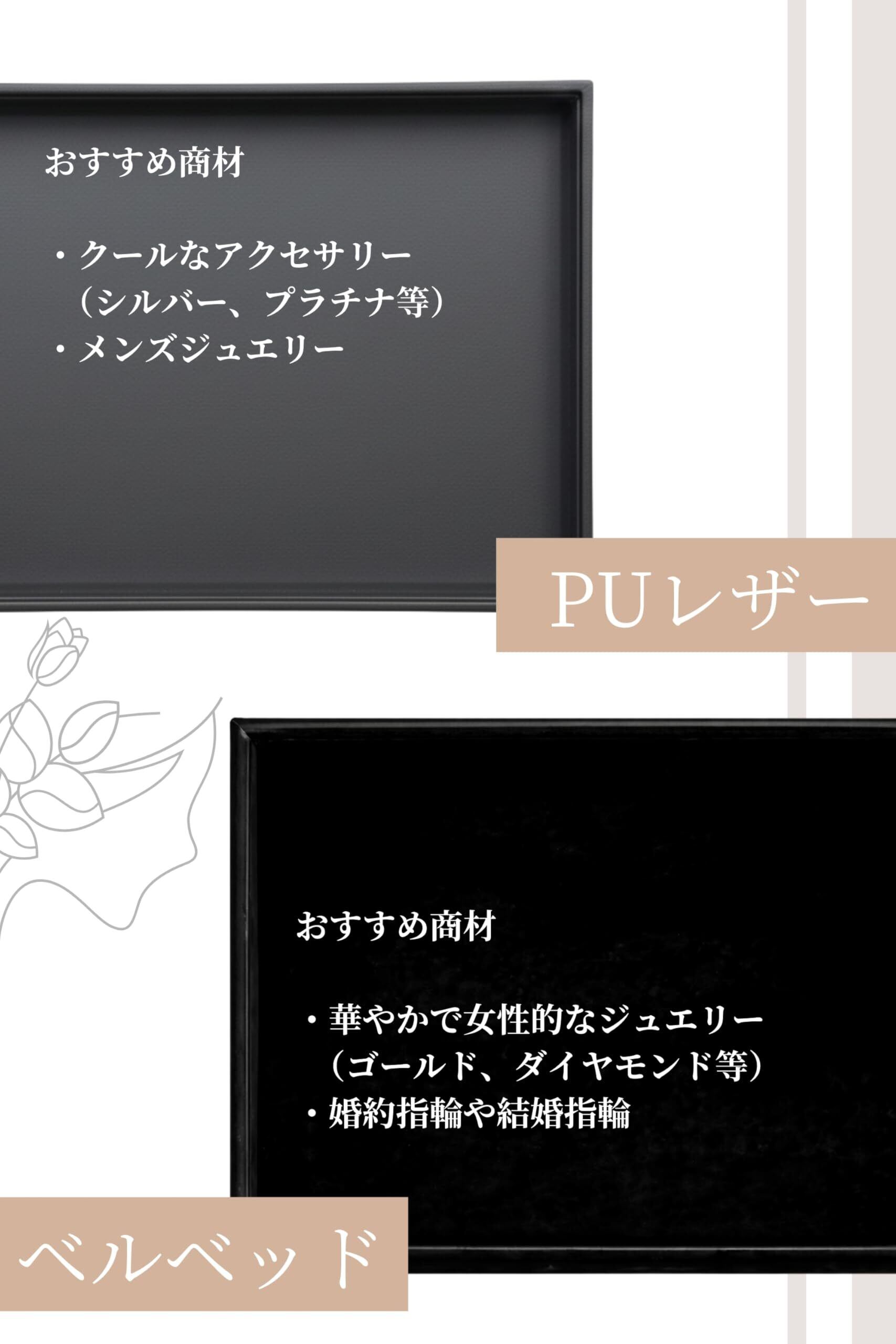 【プロ仕様のジュエリートレー】指輪や宝石の美しいディスプレイに最適なジュエリートレーです。ベロア素材とPUレザーの2種類をラインナップし、どちらも高級感と実用性を兼ね備えています。業務用として、店舗でのディスプレイや接客にもおすすめです。