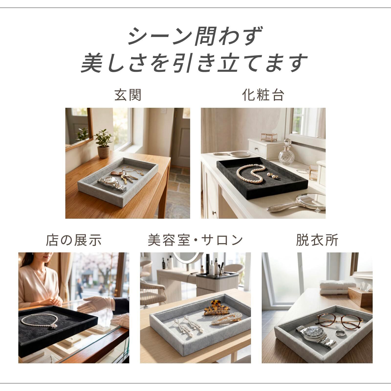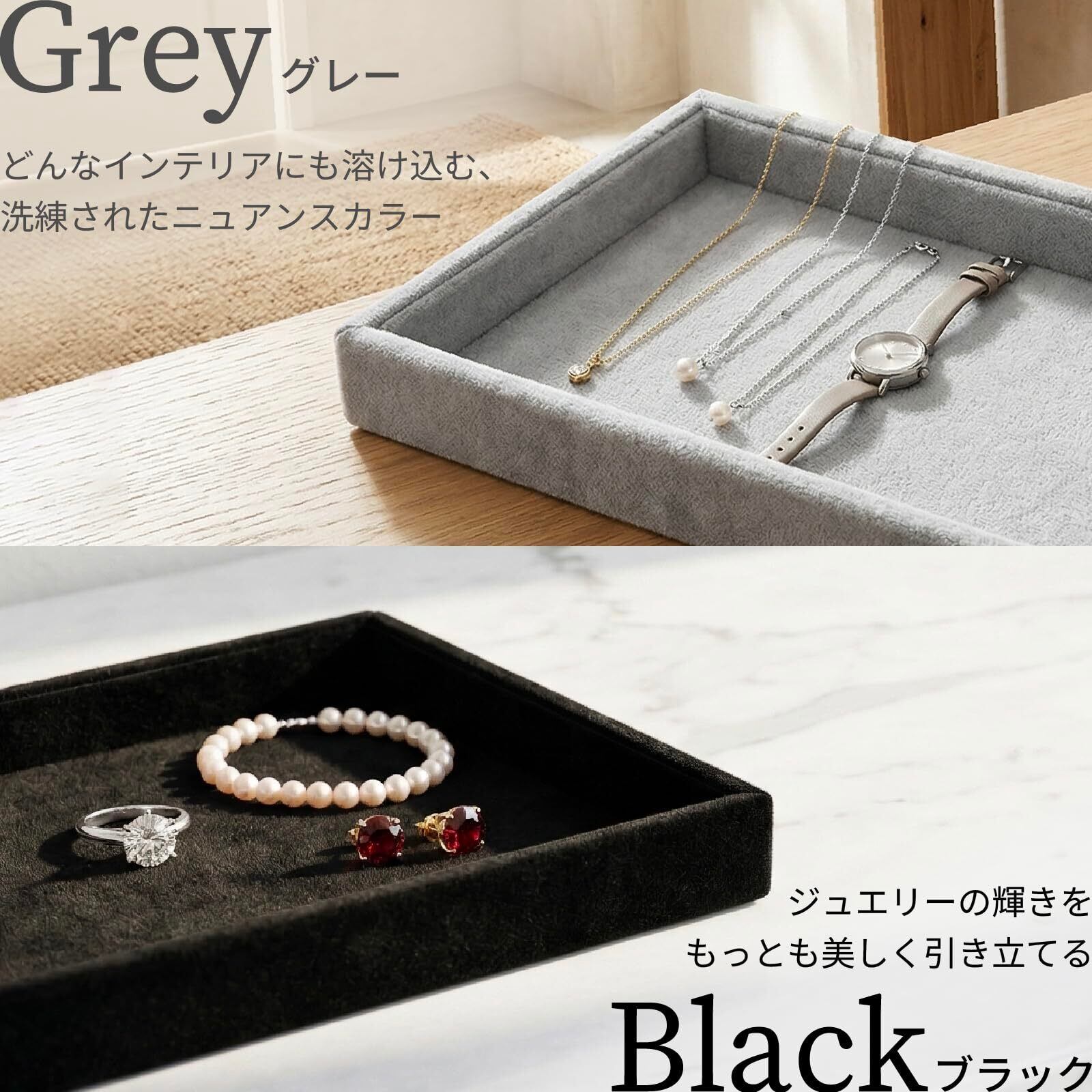 【ジュエリーを引き立てる】ジュエリーを引き立てるシンプルでおしゃれなデザイン。ベロア調のアクセサリートレイで、アクセサリーや時計、メガネ、鍵、小物などを引き立ててくれます。