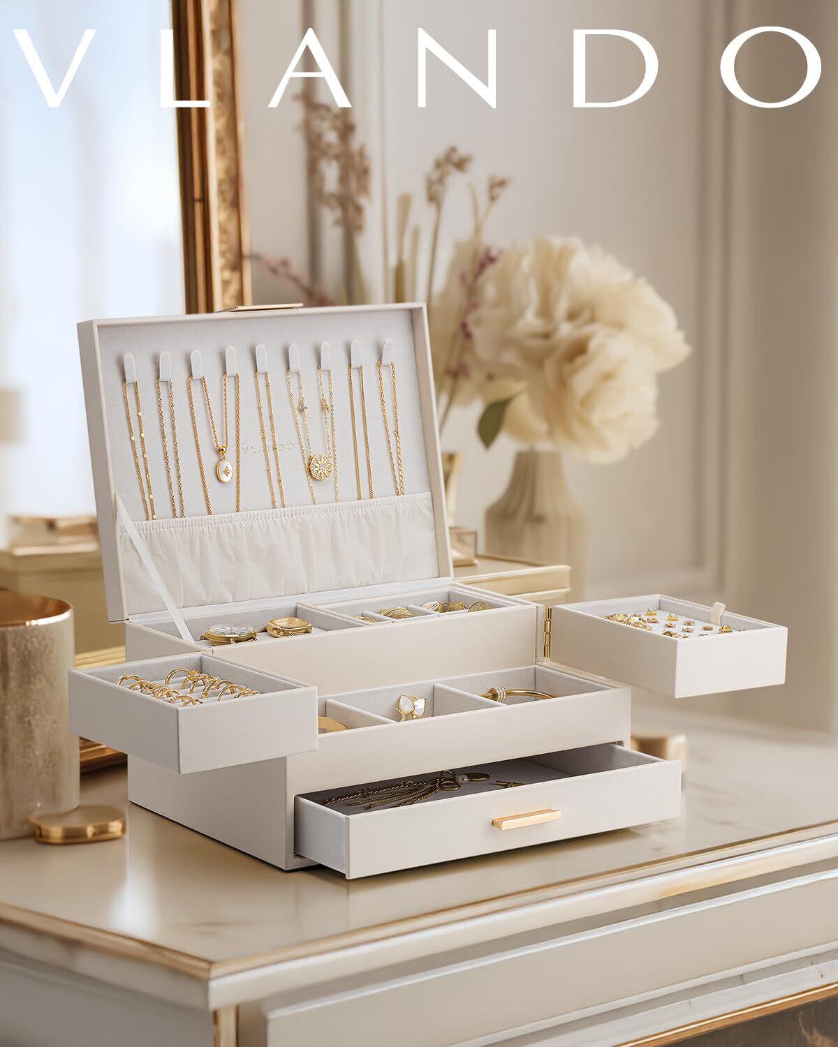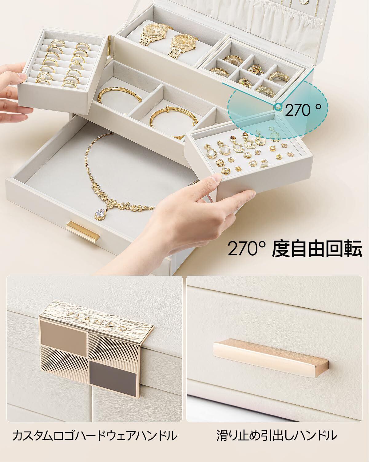 Vlandoジュエリーボックス 大容量 三層式 引き出しトレイ付き 回転可能 ネックレス リング イアリング ブレスレット用 ジュエリーオーガナイザー アクセサリー収納 プレゼント 誕生日 クリスマス 母の日 女性用(アイボリー)