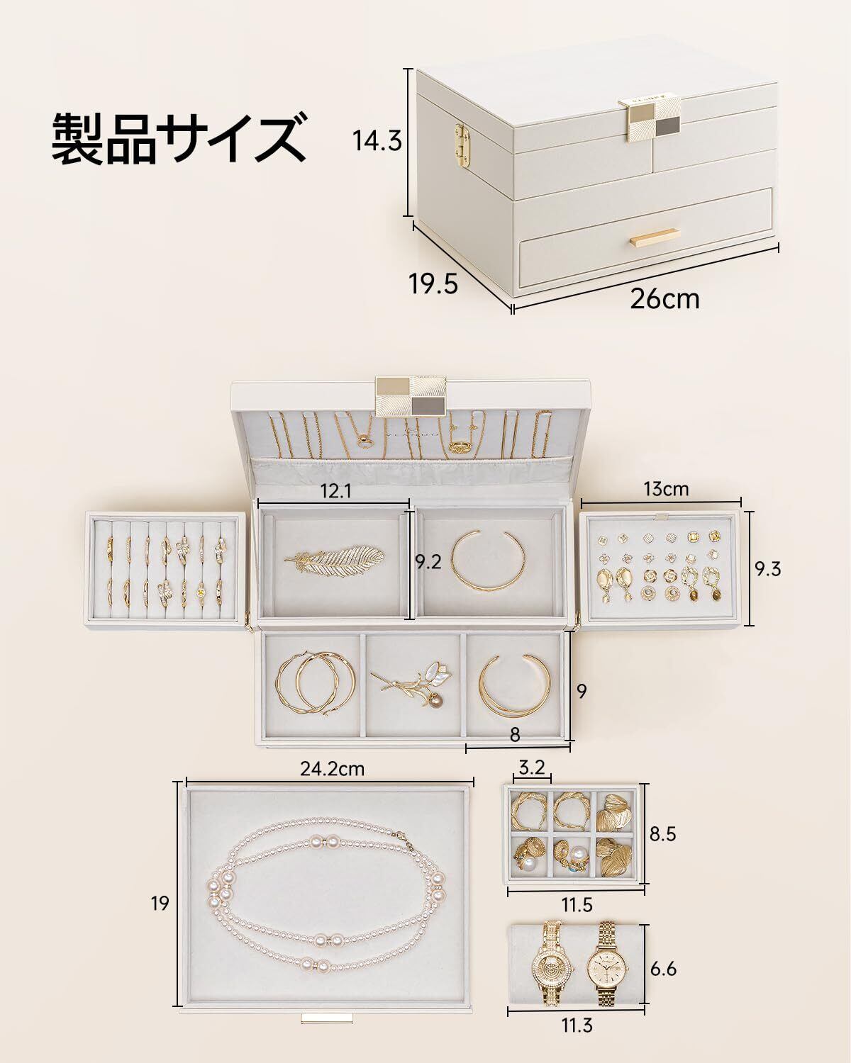 【広々としたデザイン】サイズ:26*19.5*14.3cm。3層に分かれた巧みな仕切りのおかげで、あらゆる種類のジュエリーをたっぷり収納できます。各アクセサリーに専用のスペースが設けられているので、アクセサリーを見つけやすく、整理にも役立ちます。