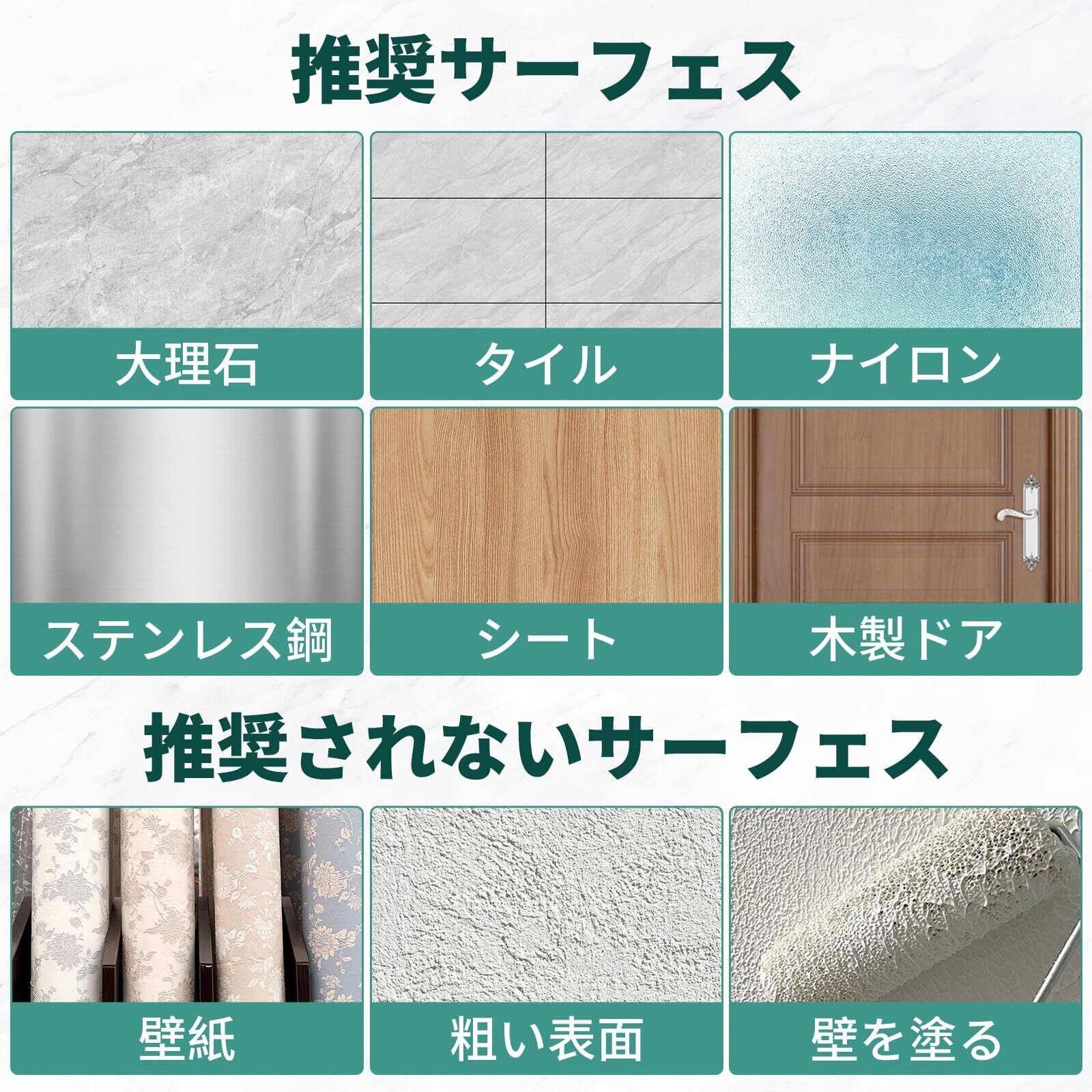 キッチンや風呂場など、様々な場所で使える便利さと、目立たないマット素材のデザイン。 丈夫で耐久性があり、繰り返しの貼り付けや張り直しも可能。しっかりとした粘着力で剥がれる心配なし。