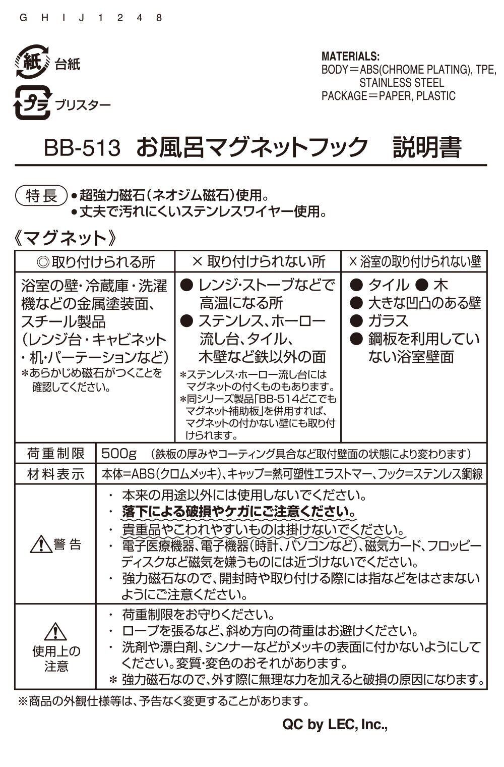 レック お風呂の壁に マグネットフック 2個入 (強力磁石) ステンレス BB-513