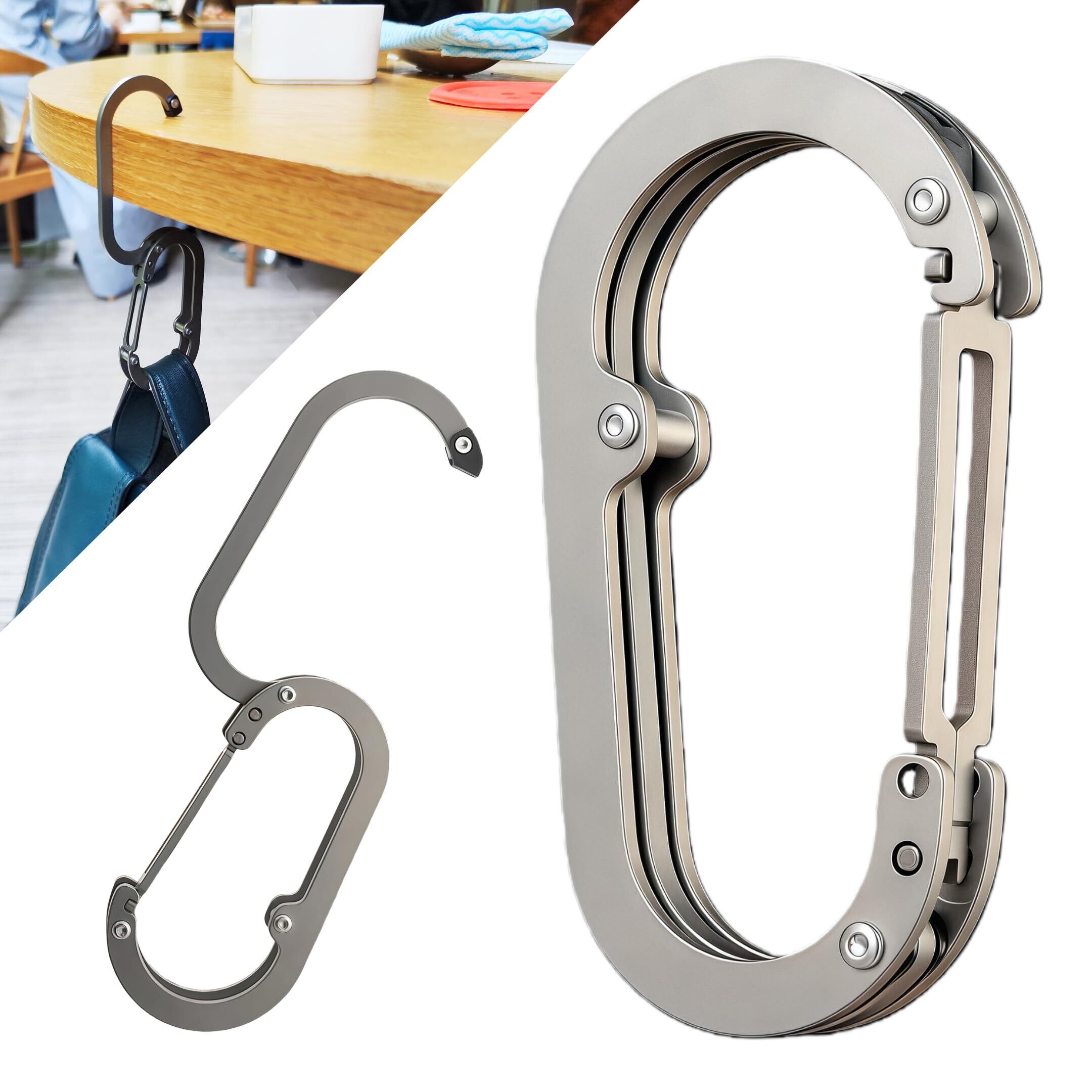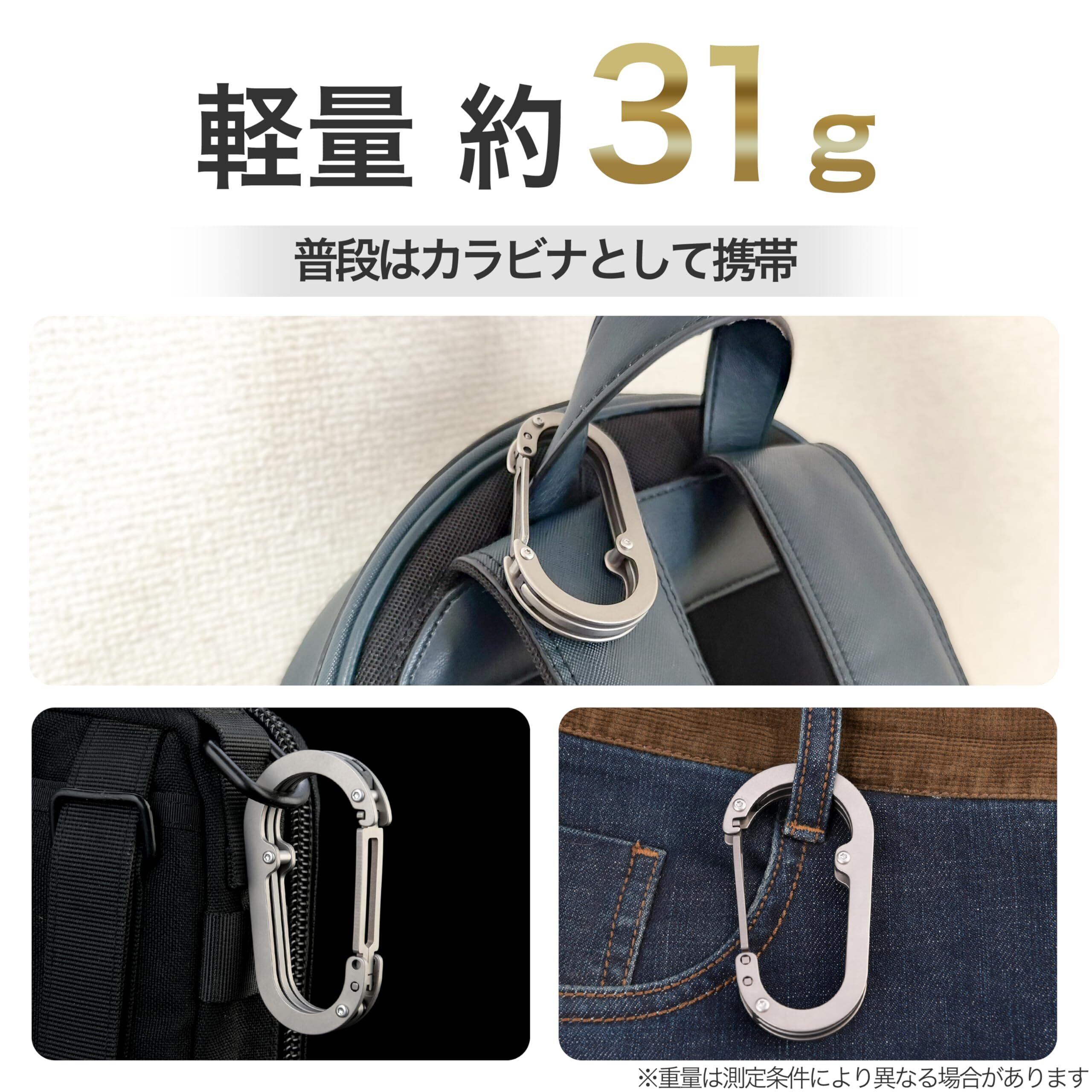 【瞬時に変形する2WAY構造】普段はカラビナとして使用でき、テーブルや棚に掛ければ即席のバッグハンガーに早変わり。使わないときはコンパクトに折りたため、ポケットやバッグの持ち手に掛けて常に携帯可能。