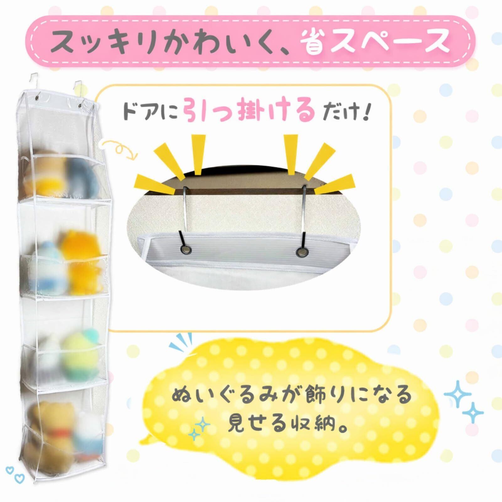 【省スペースでスッキリ片付く】 床を使わず、ドアや壁に掛けるだけのぬいぐるみ収納。お部屋の空間を広く使えるから、見た目も気持ちもスッキリ。収納スペースに悩む方にぴったりです。