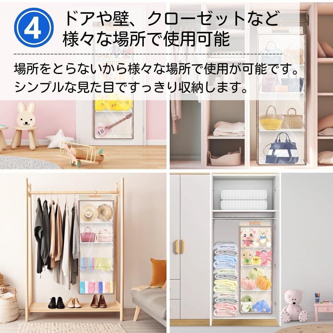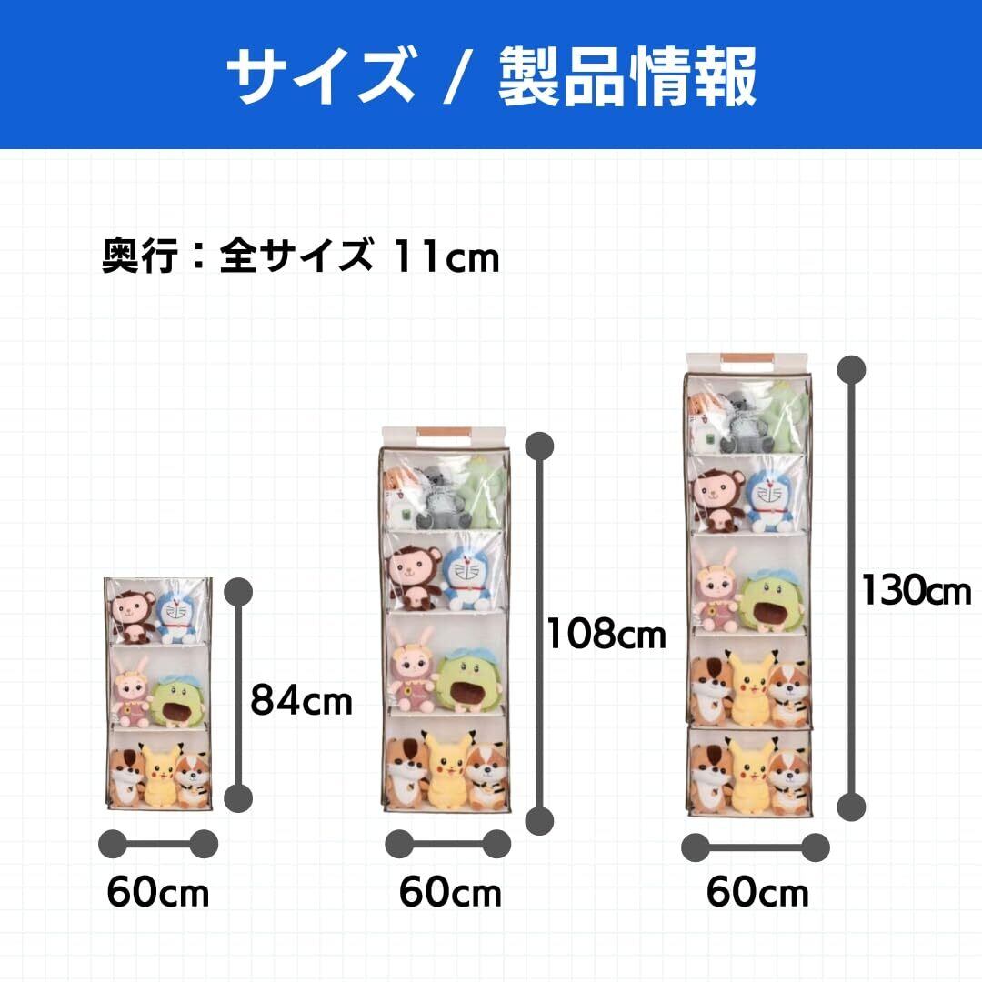 【スタイリッシュなぬいぐるみ収納】壁にかけて収納でき、スタイリッシュなデザインです。そのコンパクトなデザインは部屋に圧迫感を与えず、すっきりとした印象を与えます。 【常に綺麗な状態でぬいぐるみを保管】クリアカバーのため収納したぬいぐるみを常に見ることができるうえ、綺麗な状態を保つことができます。 【便利な側面出し入れ】側面からの出し入れができるため、使い勝手が抜群です。ぬいぐるみを取り出す際も、収納する際もスムーズに行え、日常の使い勝手を大幅に向上させます。 【多機能利用可能】様々な場所で使用が可能です。すっきりとした印象のクリアカバーであるため、お部屋も選びません。 【サイズ・スペック】3段:縦=84cm、横=60cm、奥行=11cm4段:縦=108cm、横=60cm、奥行=11cm5段:縦=130cm、横=60cm、奥行=11cm