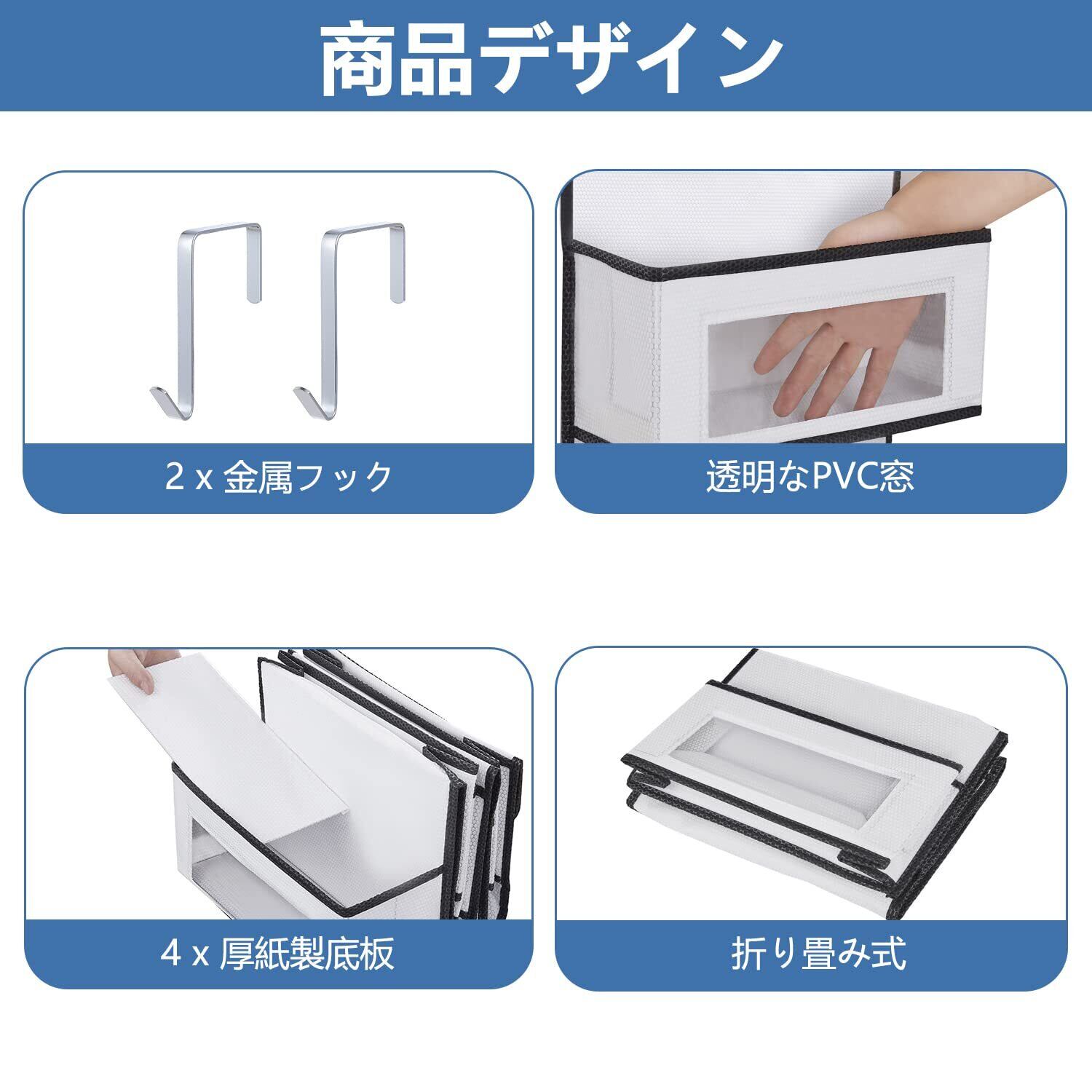 【省スペース】:折り畳み可能デザインので、使わない時はコンパクトに折り畳めるので、スペースも取らない。お好み次第で使い方自由。ドア掛け収納ポケットの2つのL字型フックでほとんどのサイズのドアやラックだけでなく、釘や壁掛けフックで壁に掛けることもできます(ご注意:ドアの厚さが4.1cm未満の場合が適しています)。
