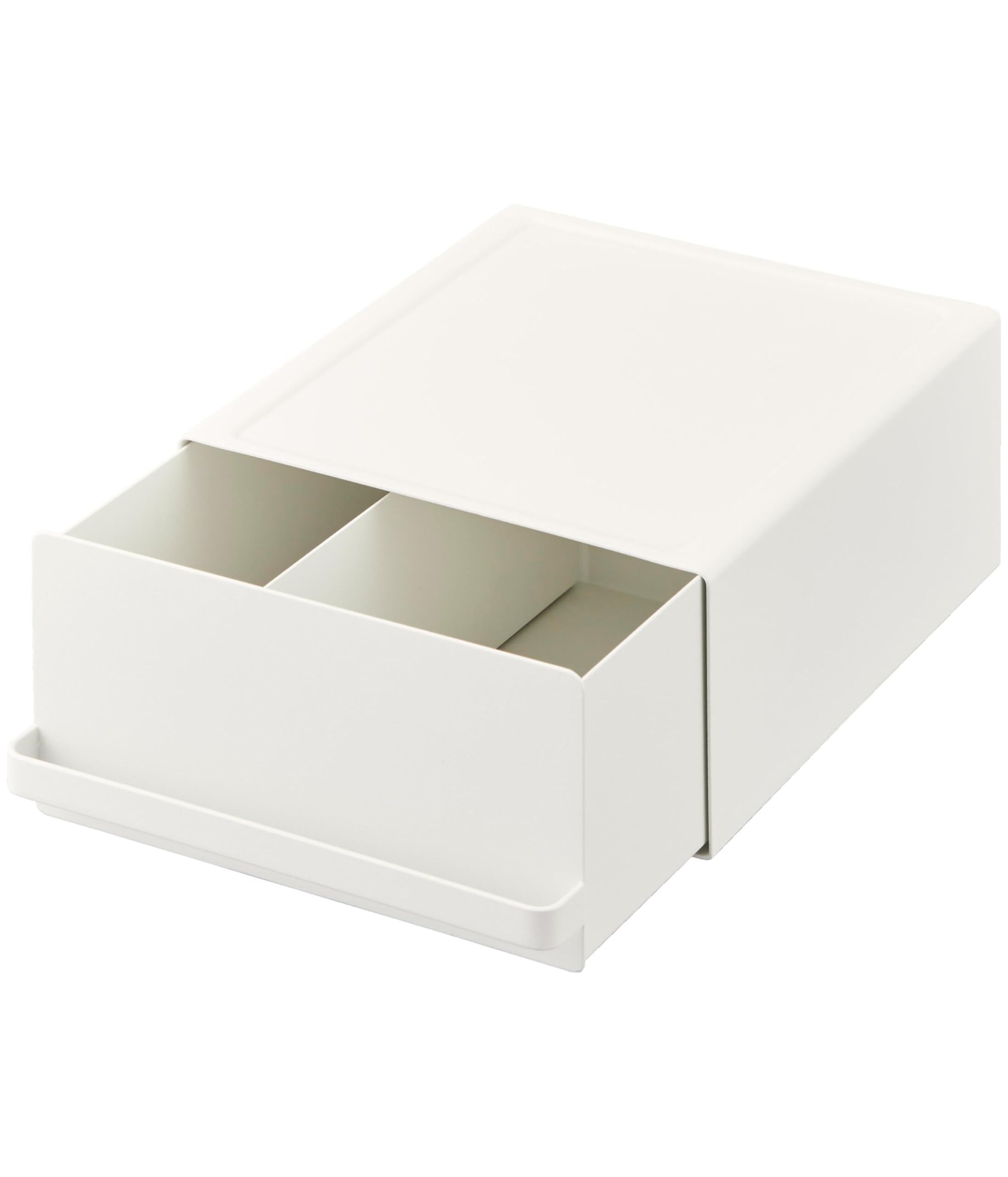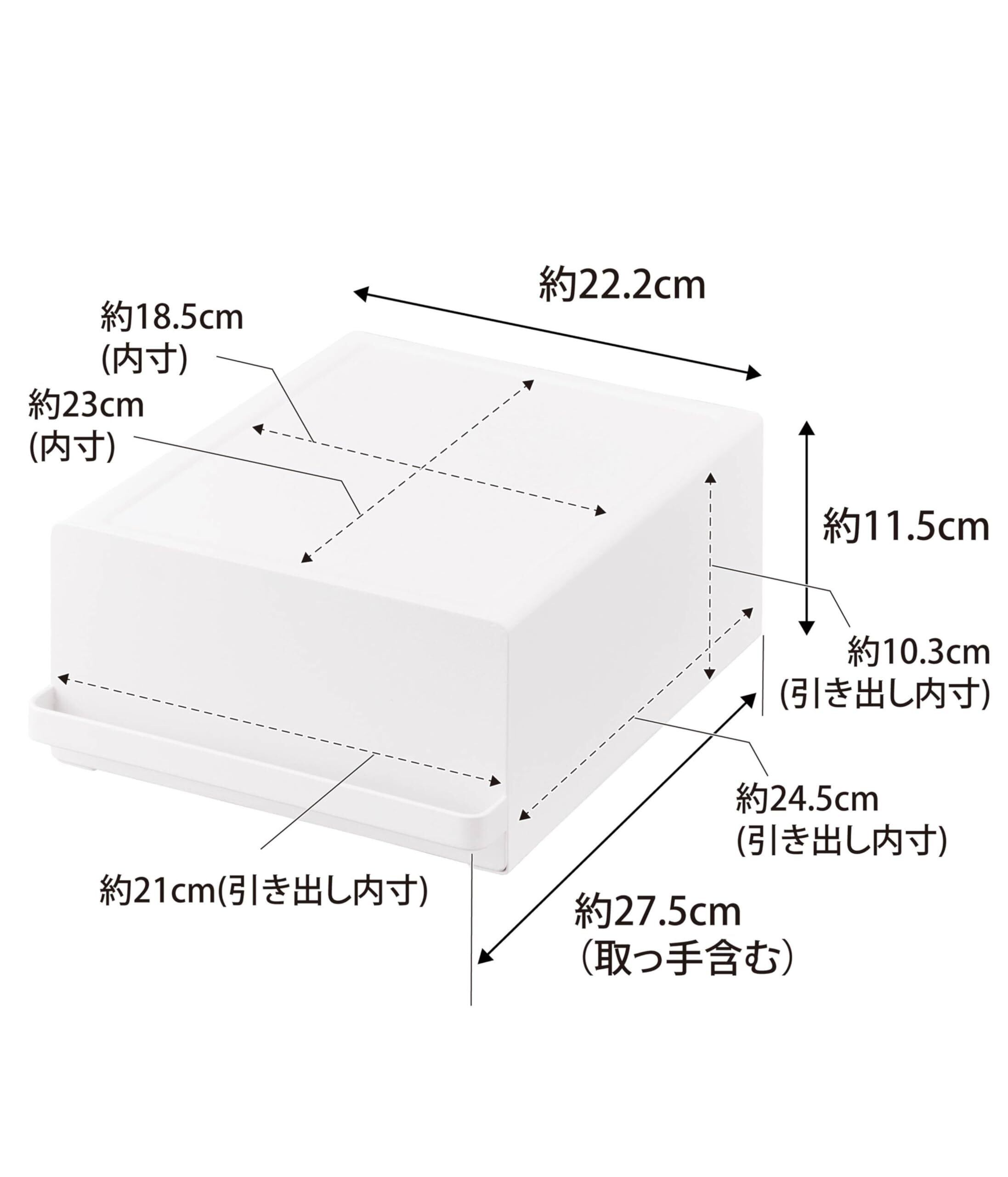 商品サイズ:約W22.2×D27.5×H11.5cm(取っ手含む)・内寸:上段(凹み部分):約W18.5×D23cm引き出し:約W21×D24.5×H10.3cm(仕切り板含まず)