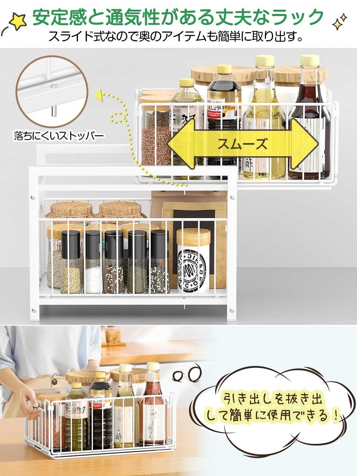 【取り出しやすい 便利なスライド式】シンク下の高さだけでなく奥行きも存分に生かせます。スライドできる引き出しだから、物の取りや収納は簡単になります。調味料置きはもちろん、洗剤のストック、リビングと食卓周りの小物類も入れられます。引き出し整理に役立つアイテムで、たっぷり収納できるシンク下の引き出し収納。