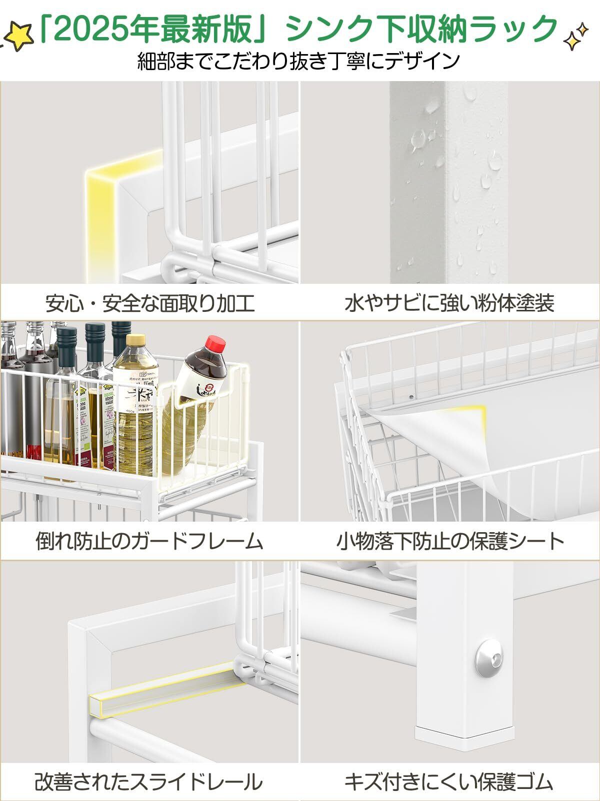 【お手入れも楽々】◎防サビ加工:引き出しやフレームにはしっかり防サビ加工を施してある。シンクの下や洗面台の下など湿気の多い場所で使うのに最適。◎丁寧に仕上げた滑らかな加工:フレーム角には滑らかな加工を施し、安心してお使いいただける。