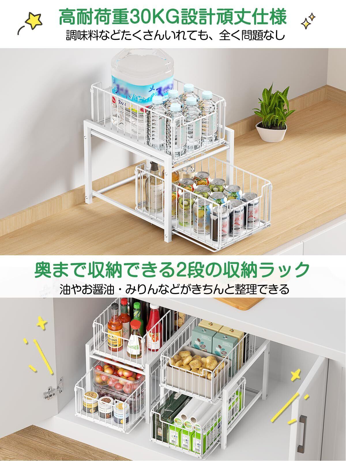 【シンク下 収納 スライド商品仕様】サイズ全体:幅27×奥行37×高さ38.5cm 引き出し×2(内寸):幅20cm×奥行33.3cm×高さ15m 上段から下段:17.5cm/材質:フレーム・引き出し・パイプ :炭素鋼/重量:約2.2kg/2色展開:ホワイト/ブラック/耐荷重:引き出し一個約15Kg 総耐荷重30Kg