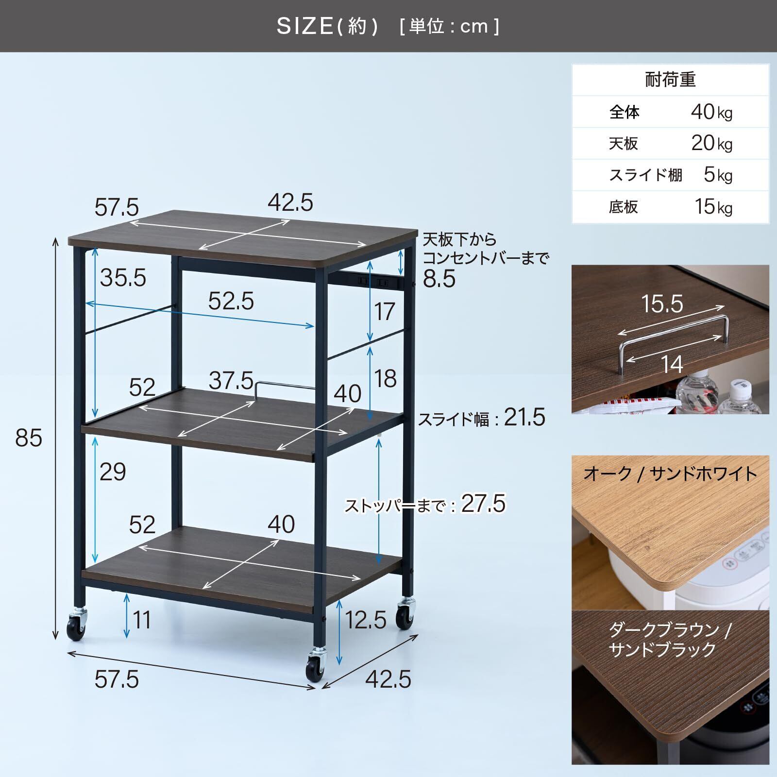 ●本体サイズ : 幅57.5×奥行42.5×高さ85cm●全体耐荷重40kg[以下の耐荷重の範囲内でご使用ください。天板20kg、スライド棚5kg、底板15㎏]●構造部材 : フレーム/金属(スチール)●甲板の表面材 : 合成樹脂化粧繊維板(塩化ビニル樹脂)●表面加工 : フレーム/エポキシ樹脂塗装