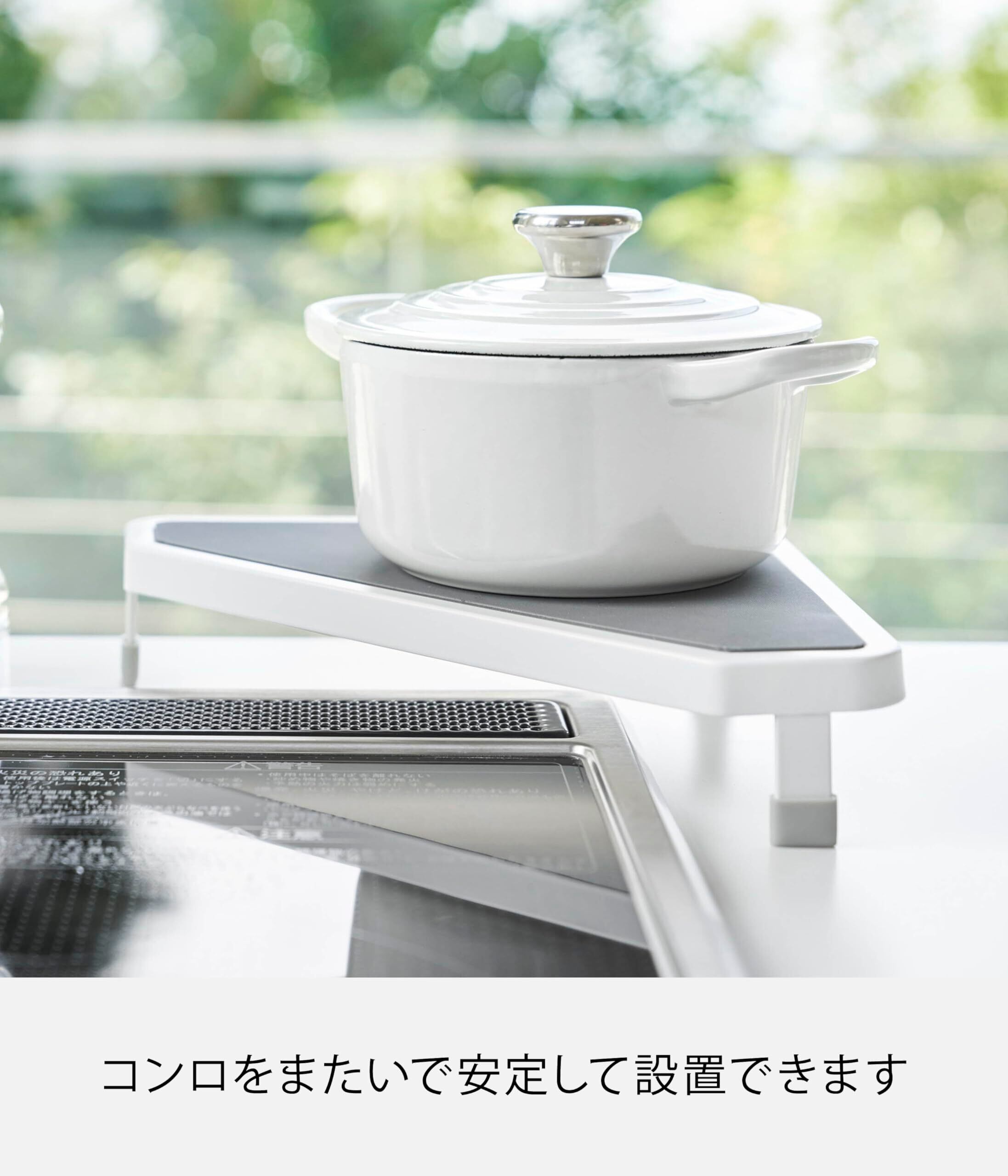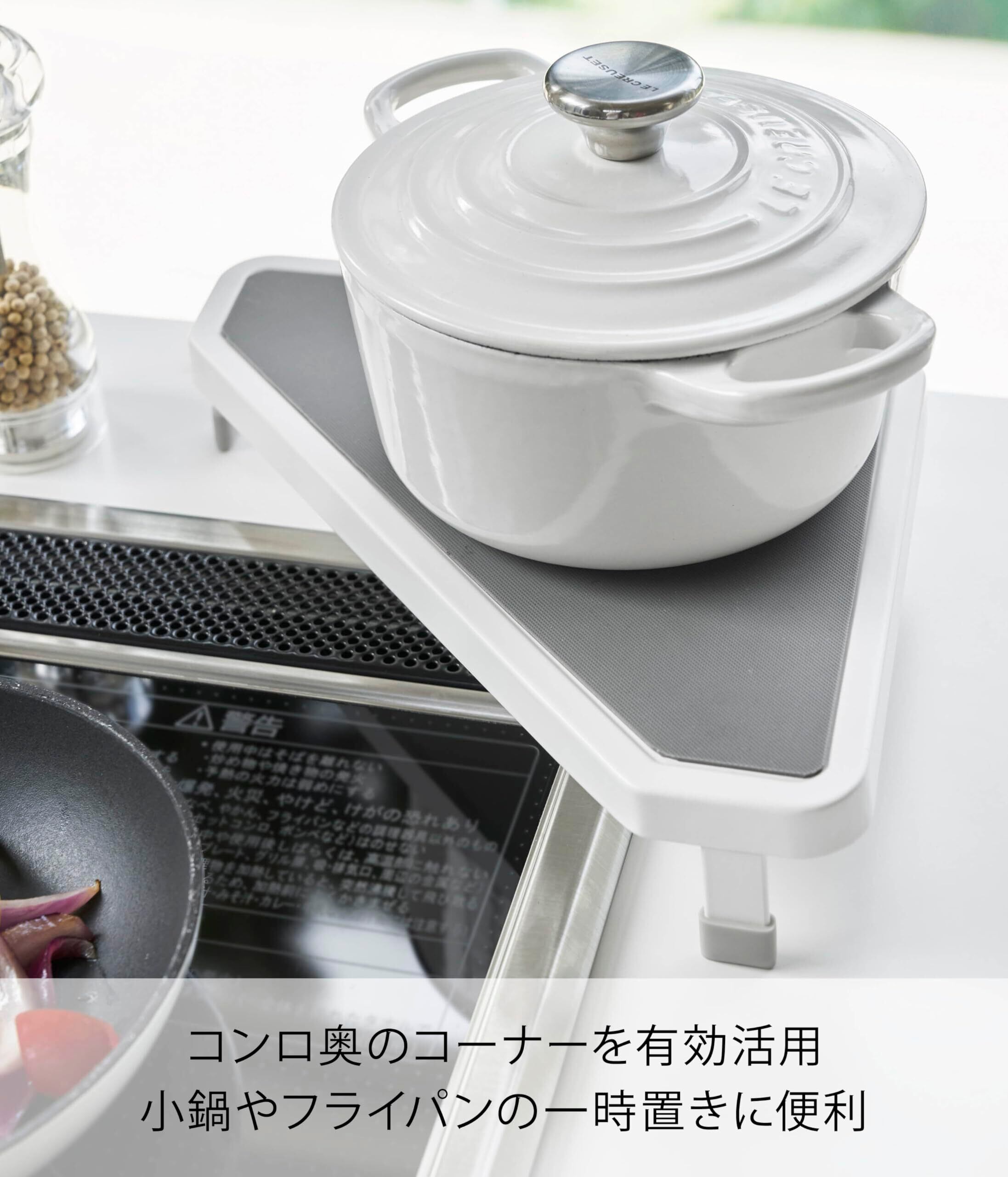 コンロ奥のコーナーを有効利用。鍋やフライパンの一時置きに便利。