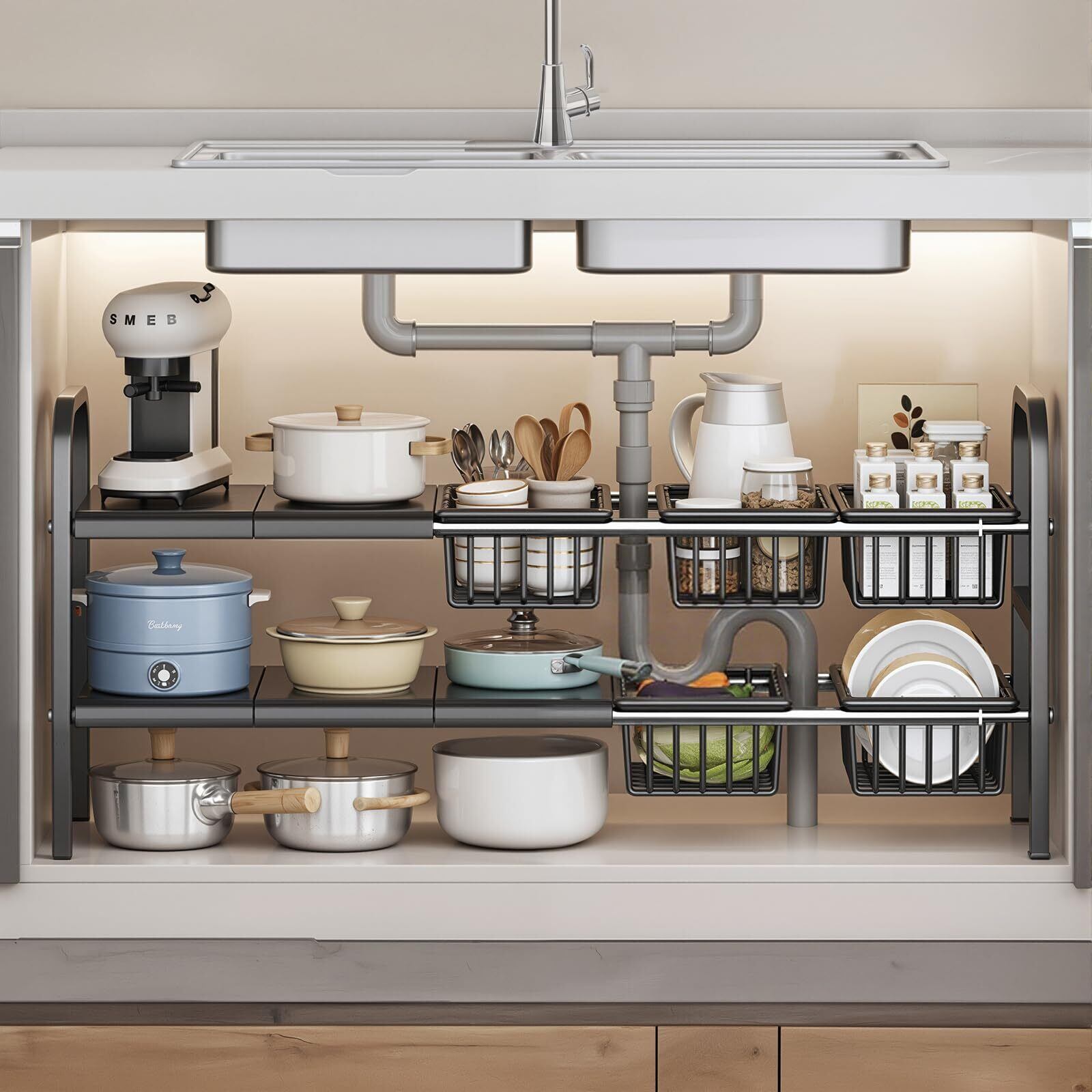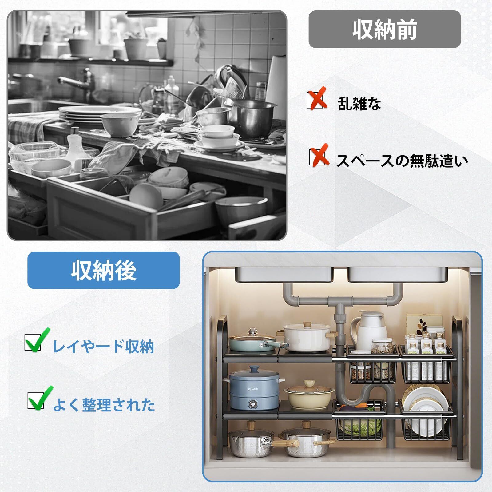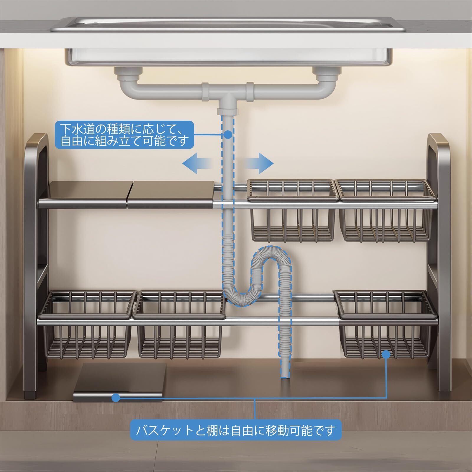 シンク下収納伸縮ラック仕様:シンク下収納の悩みを解決!幅54-88cm×奥行25×高さ44cm、自由伸縮設計で様々なキッチン下収納スペースにぴったり。取り外し棚&バスケットで障害物を避け、食器や調理器具をカテゴリー別にスッキリ整理。シンクラックは4つの棚+ 4つの収納バスケットで設計されており、シンク下の隙間を有効活用し収納力アップ!
