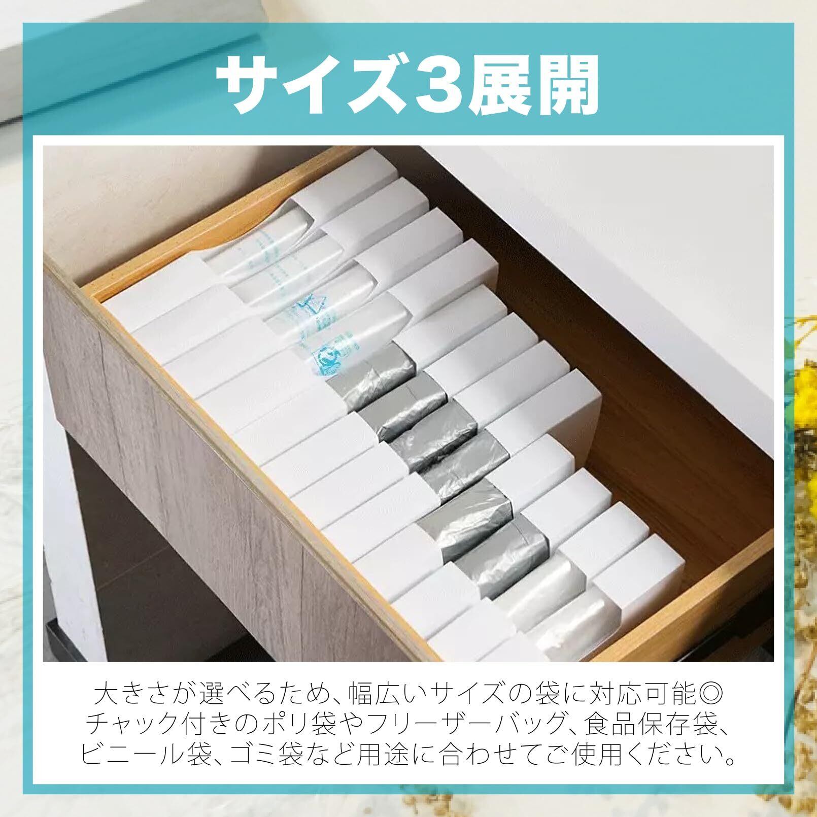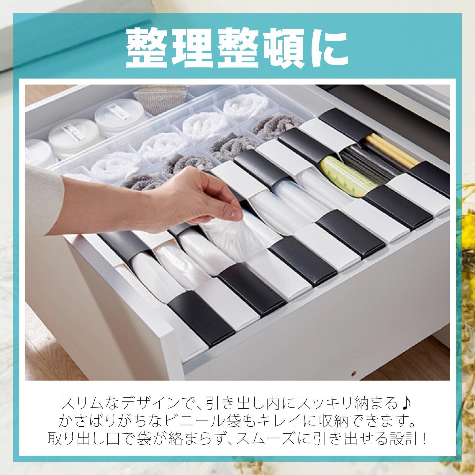 【整理整頓に】スリムなデザインで、引き出し内にスッキリ納まるかさばりがちなビニール袋もキレイに収納できます。取り出し口で袋が絡まらず、スムーズに引き出せる設計!