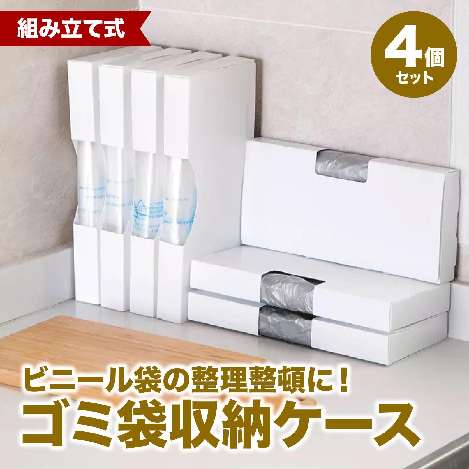 ビニール袋の整理整頓に!組み立て式のゴミ袋収納ケース4個セットです。つまんで引き出すだけでポリ袋が簡単に引き出せるカラーはホワイトまたはブラック、サイズはS,M,Lからお選びください。
