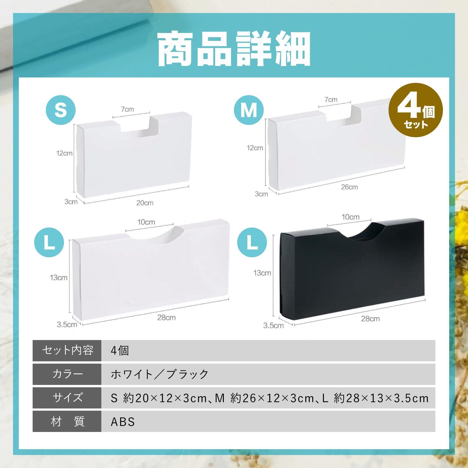 【商品詳細】セット内容:4個 カラー:ホワイト/ブラック サイズ:S 約20×12×3cm、M 約26×12×3cm、L 約28×13×3.5cm 材質:ABS ※モニターの環境により、色の見え方に若干差が生じる場合がございます。