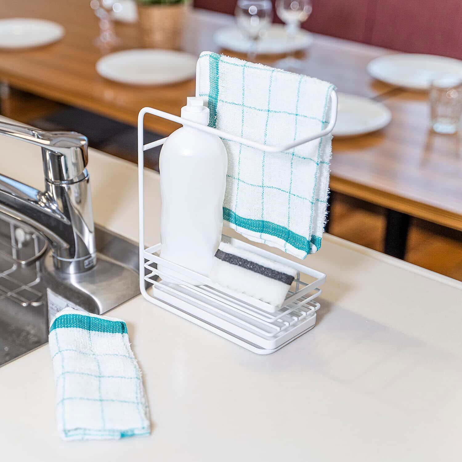 【キッチングッズまとめてスッキリ】:ふきんは二枚まで掛けることができ、ラックにはスポンジや洗剤を置いておける。