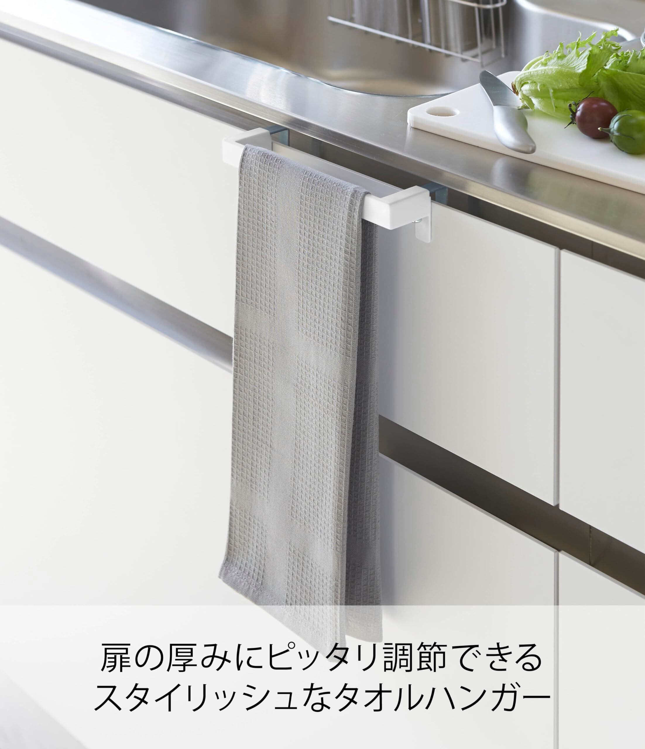 キッチン・洗面所・トイレの扉などにシンプルでスタイリッシュなデザインのタオル掛けです。