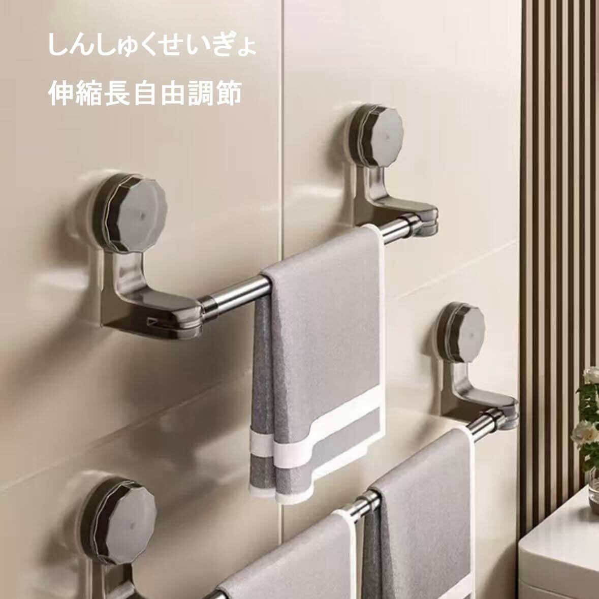 本品は強力吸盤式のタオルハンガーです。ブラックのシンプルでおしゃれなデザインが、さまざまな室内空間に調和します。30cmから60cmまで自由に伸縮可能な設計で、限られたスペースでも柔軟にご利用いただけます。高性能吸盤はタイル、ガラス、鏡面などの滑らかな表面に強固に吸着し、工具や穴開け作業なしで簡単に取り付け可能です。壁面を傷つける心配がなく、賃貸住宅でも安心してお使いいただけます。すべり止め加工を施した表面はタオルをしっかりと保持し、滑り落ちを防止します。浴室、洗面所、キッチン、トイレなど、多様なシーンで活躍し、タオルや軽い物品の整理整頓に最適です。コンパクトで省スペースな設計ながら、実用的な収納力を備えています。取り外しも簡単で、お手入れも楽々です。シンプルながらも機能性に優れた、日常生活を快適にするアイテムです。