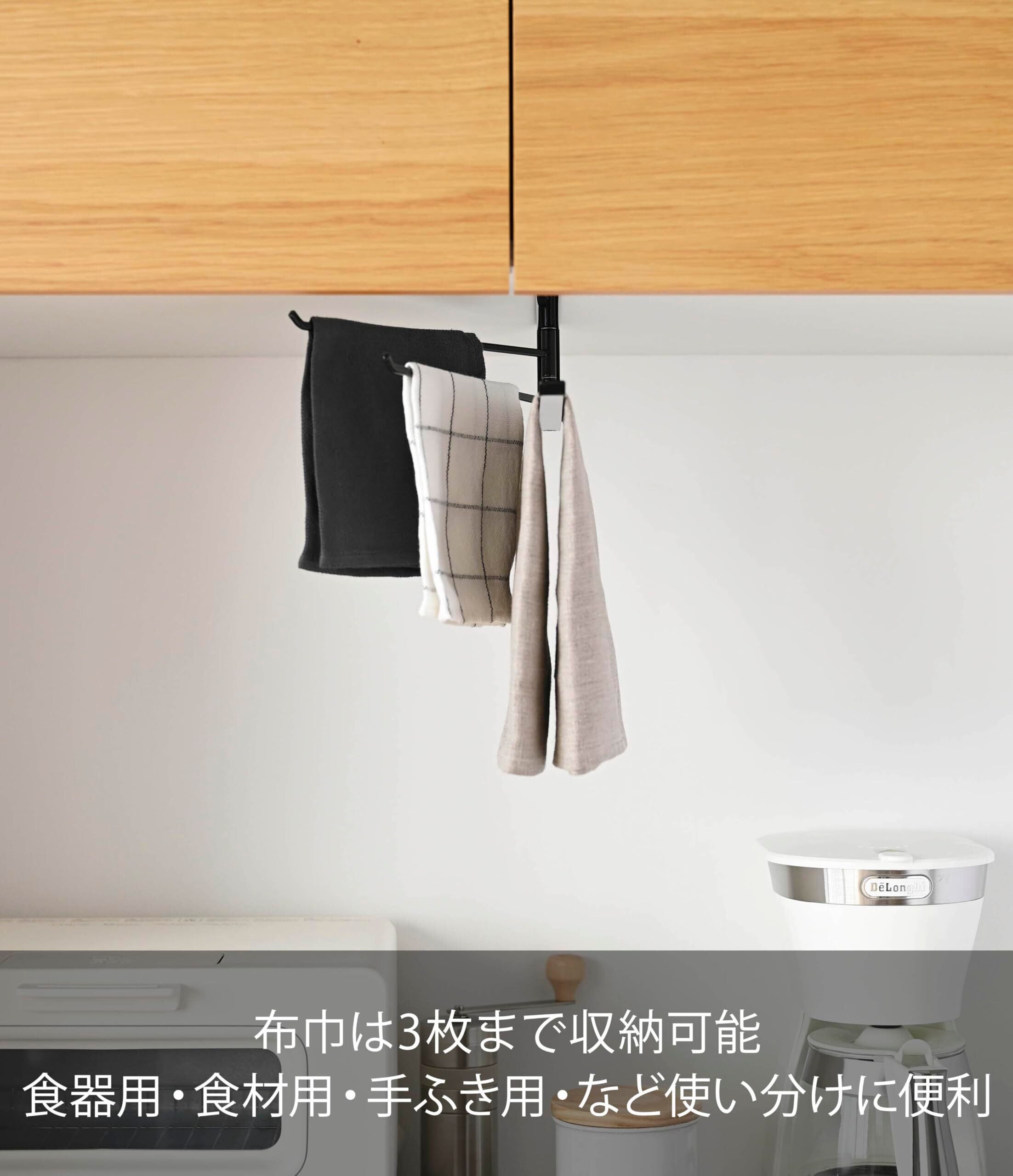布巾を3枚掛けられるので、食器用・食材用・手ふき用など使い分けに便利。上2本のハンガーはスライドして角度が付けられます。サイズ:約W1.5×D26×H9.5(cm)重量:約310g素材:本体:スチール(ユニクロメッキ+粉体塗装)その他:※耐荷重:約500g※取り付け可能な吊り下げ戸棚:1.4~2cmまでに対応