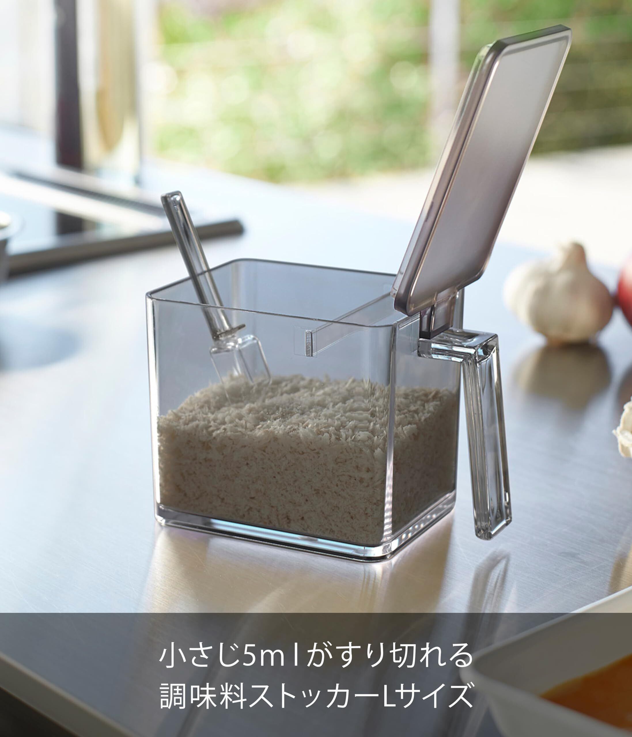 スプーンは本体にセットして収納でき、すり切り板が支えになるので調味料の中にスプーンが埋もれないのも◎片手でフタをオープンでき、そのままキープでるのもポイント!