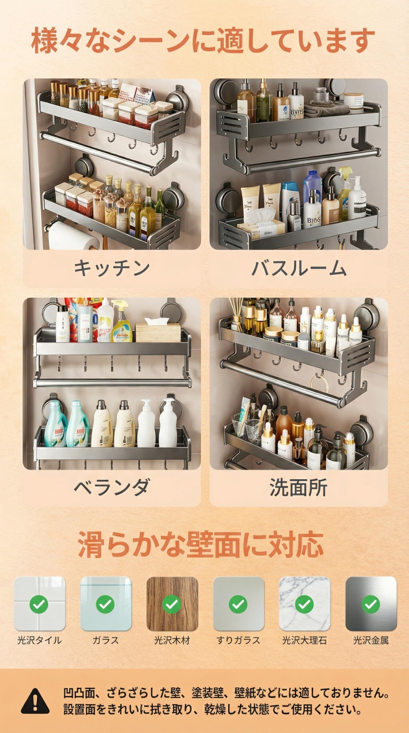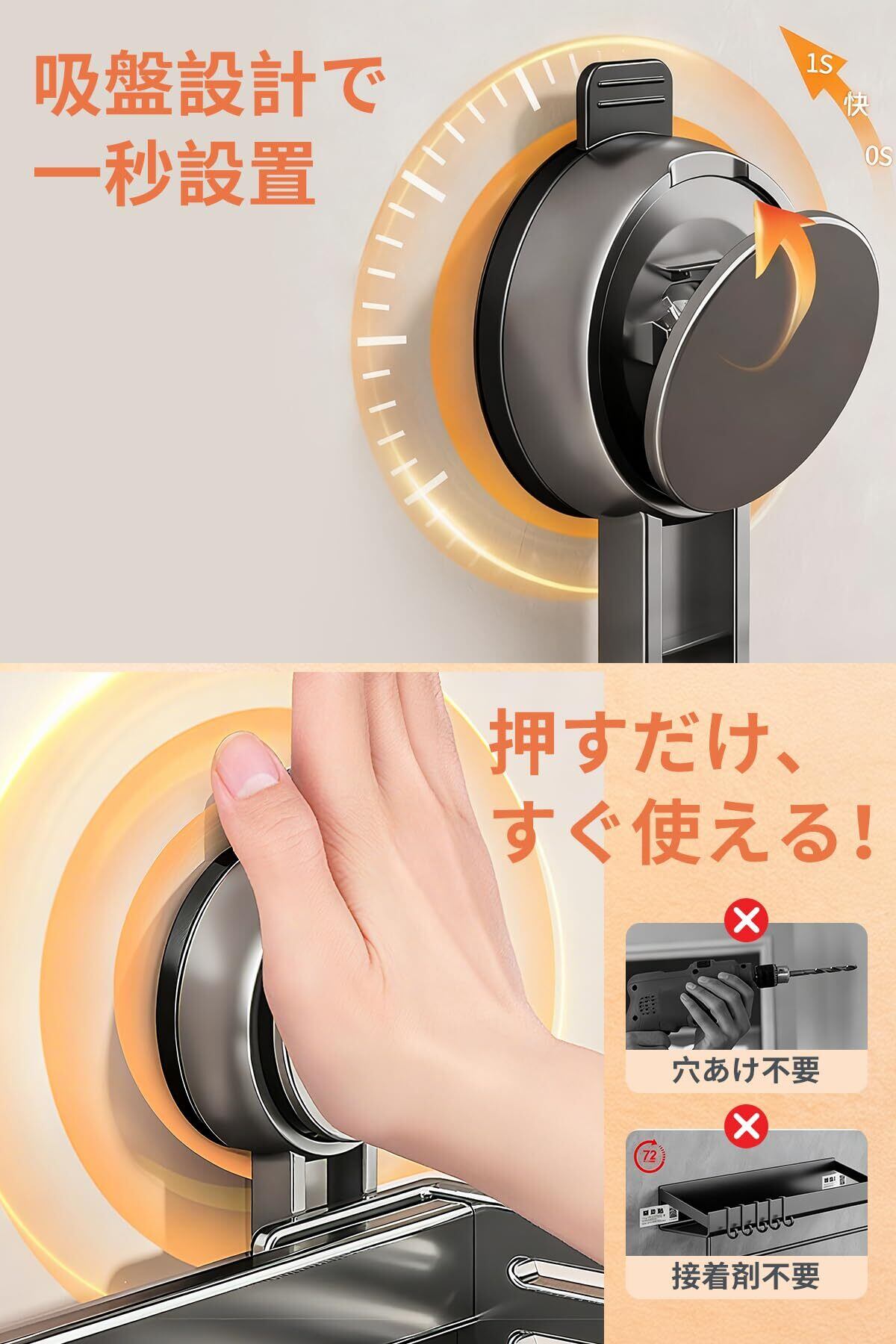 【正しく取り付けて安定して使える】工具不要で取り付け可能です。吸盤をしっかり密着させ、安定していることを確認してからご使用ください。重い物を収納する場合は、取り付け後しばらく置いてからご使用いただくことで、より安心してお使いいただけます。賃貸住宅でも、タイル張りのキッチンや浴室でも、壁を傷つけることなく理想の収納スペースが完成します。