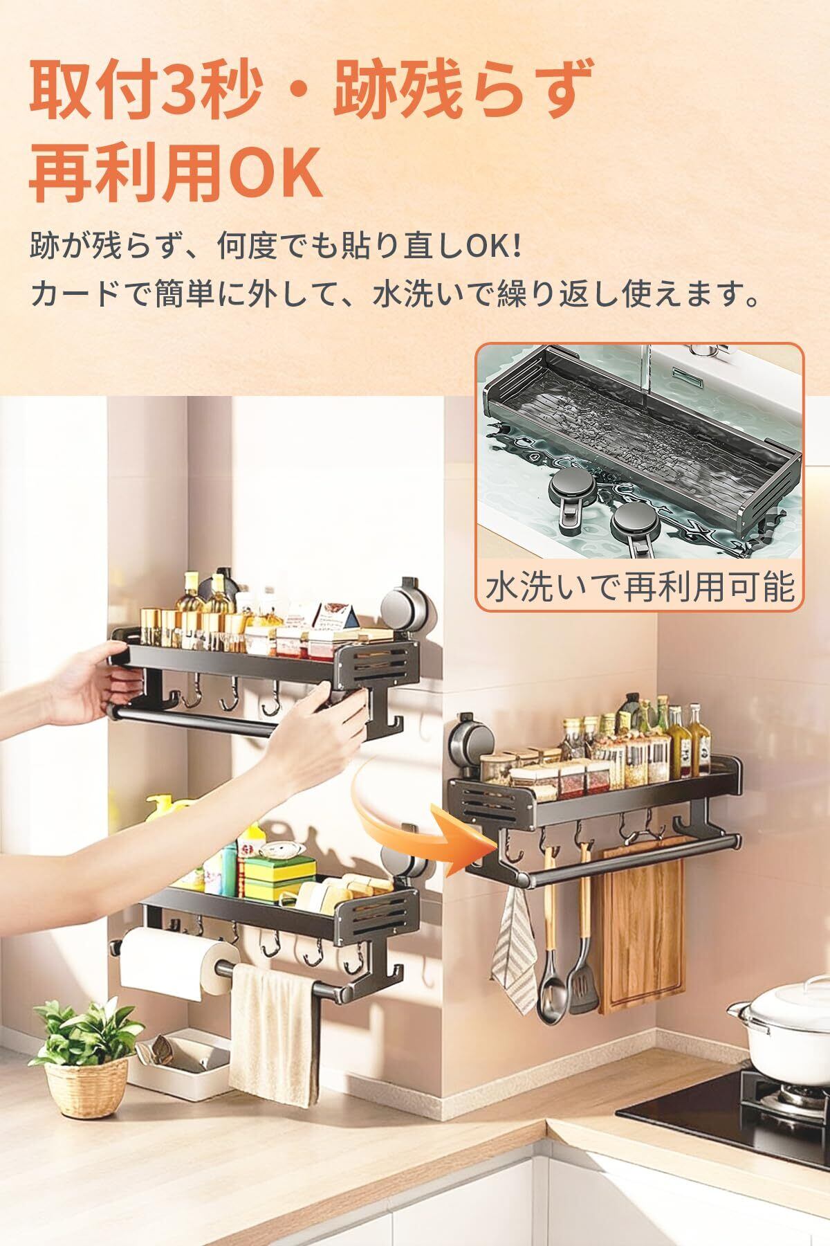 【穴あけ不要で壁面を有効活用】吸盤式で取り付けられる収納ラックです。調味料、スパイス、キッチン小物などをまとめて収納でき、限られたスペースをすっきり整理できます。キッチンペーパーホルダーとして使えるバーと、便利な5つのフック付きで、毎日の家事をより快適にサポートします。