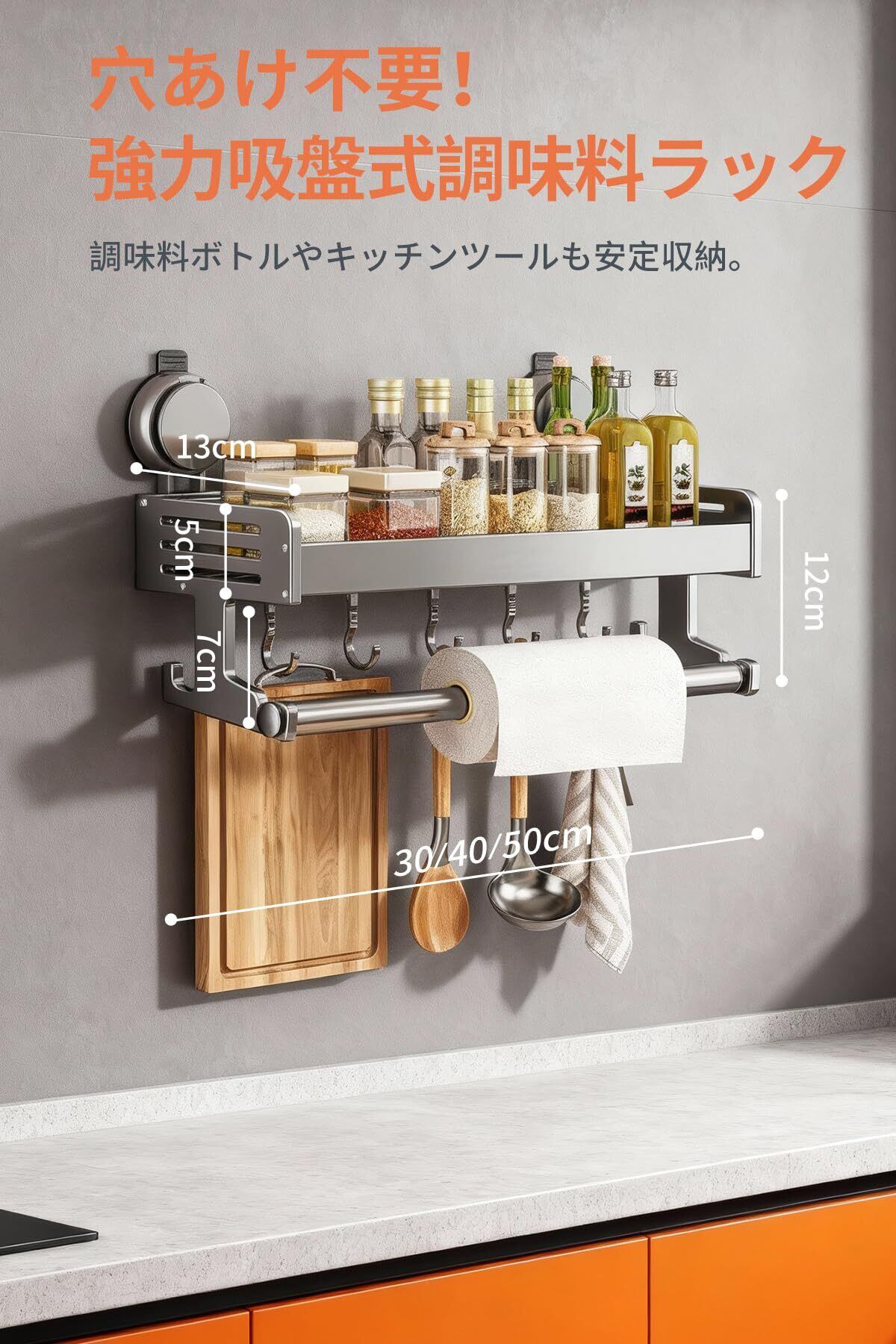 調味料ラック 強力吸盤 キッチン収納 耐荷重5~7kg アルミ製 防水防錆 キッチンペーパーホルダー 5フック付き 穴あけ不要 壁掛け 布巾置き キッチン/風呂場/洗面所 収納棚 (50cm)