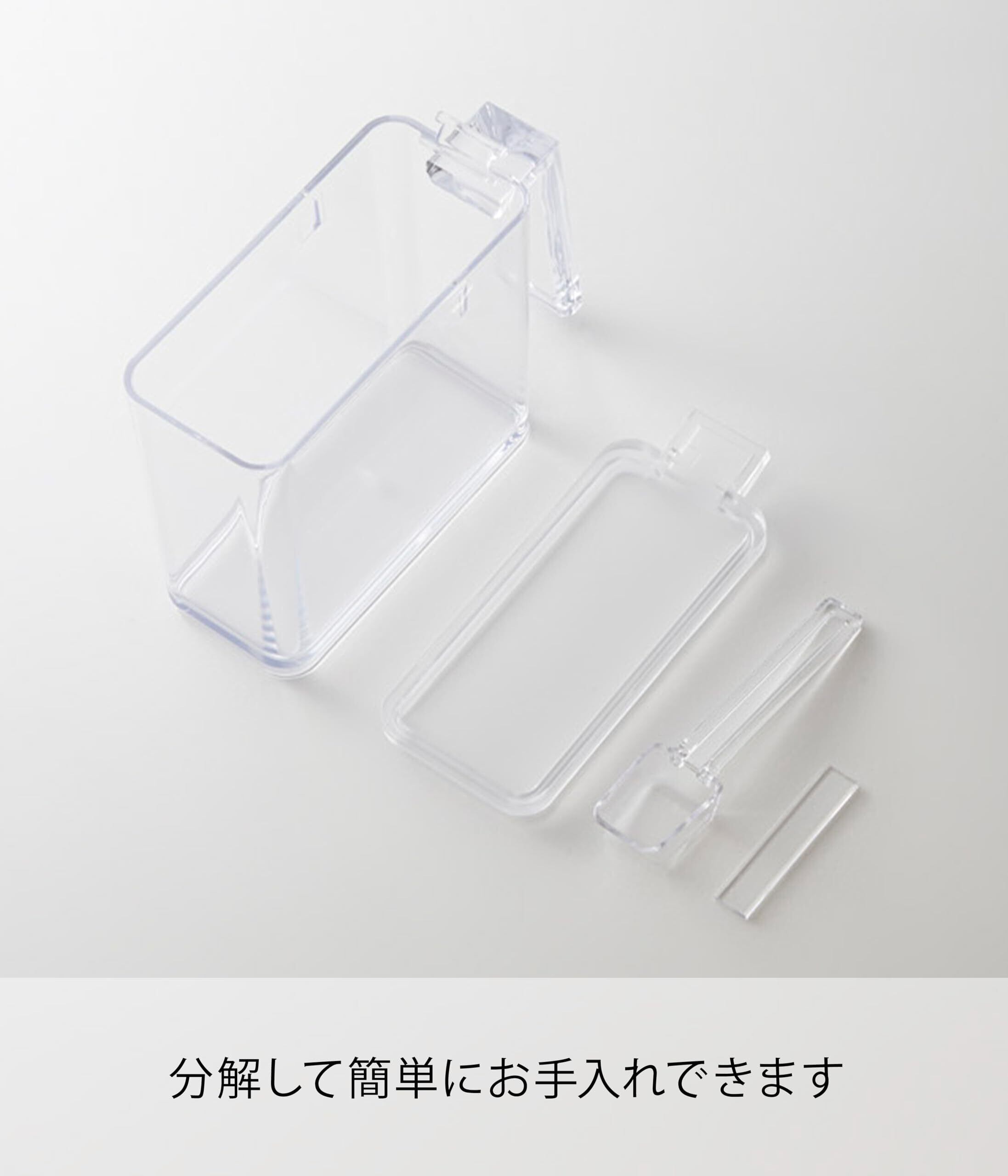 容器の角が丸いのでスミまで洗いやすく衛生的!すべてのパーツが外れるのでお手入れも簡単!スクエアの形状なので、デッドスペースが軽減されスッキリ収納できます。