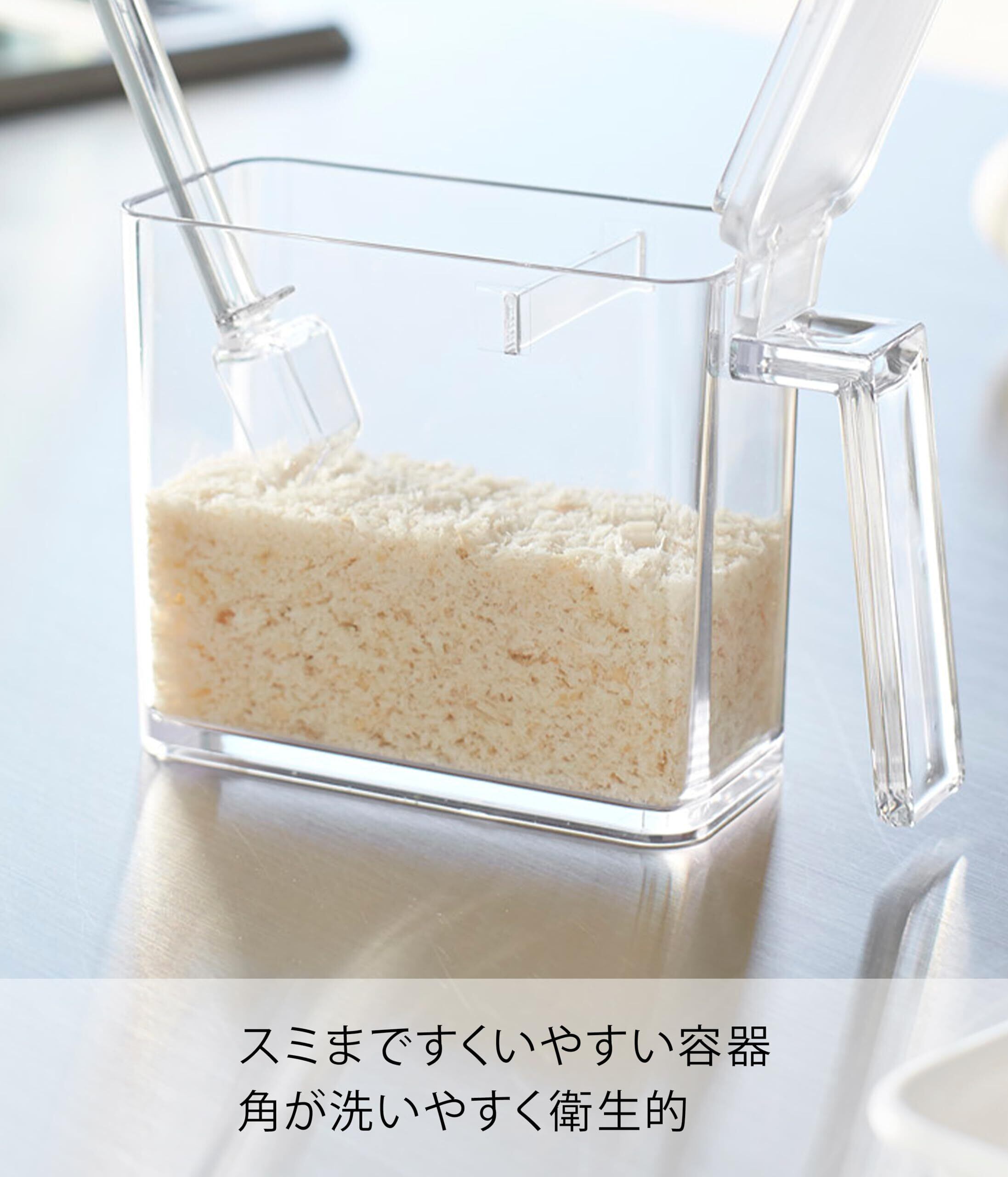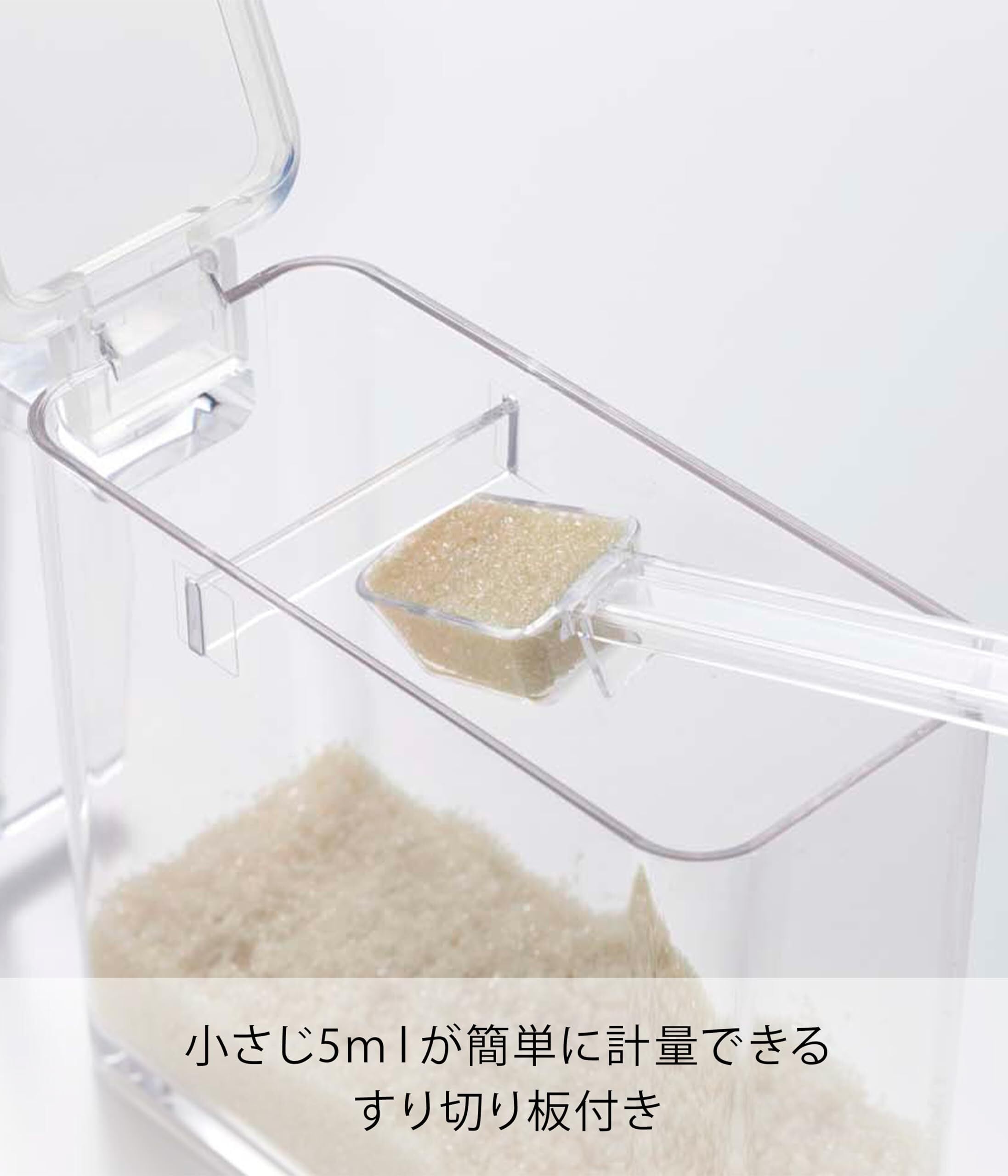 よく使う砂糖、塩、だしの素、小麦粉、片栗粉などを入れておくのに便利ストッカー内部のすり切り板で、小さじ5ml分をぴったりフラットにスプーンに盛ることができます。