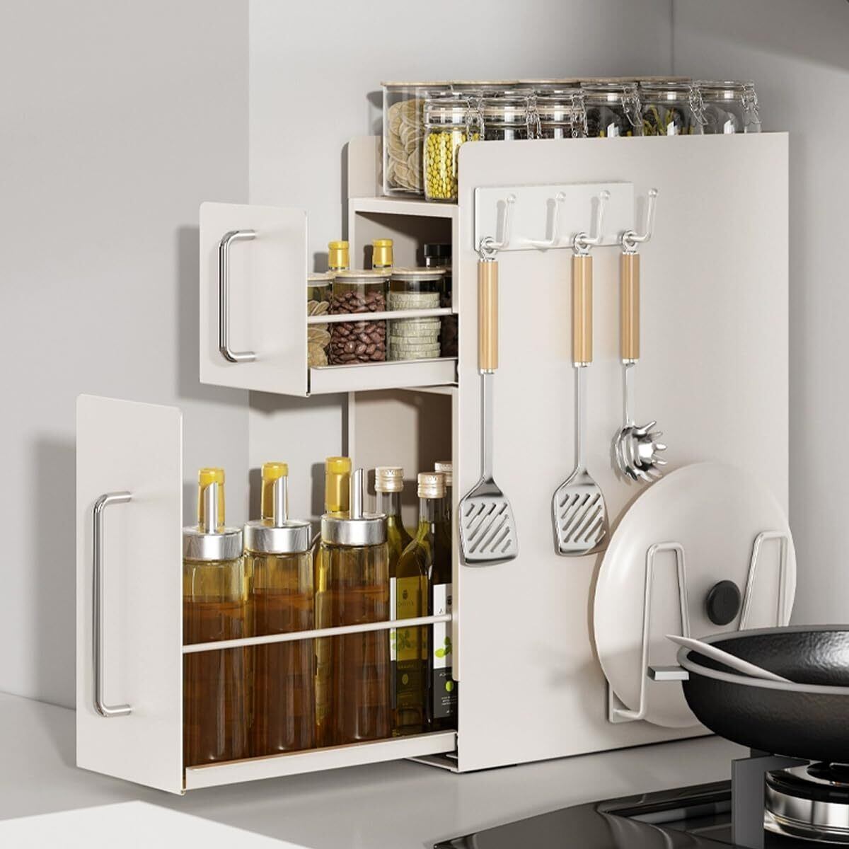【場所を取らない引き出し式】両側に落下防止フレームが設計され、スパイスやボトルをしっかり守ります。取り出しやすさ、隠せる調味料ラックは通常、調理エリアの近くの隠れた場所に置かれているため、簡単に取り出すことができ、スパイスを探す時間を減らし、調理の効率を上げます。