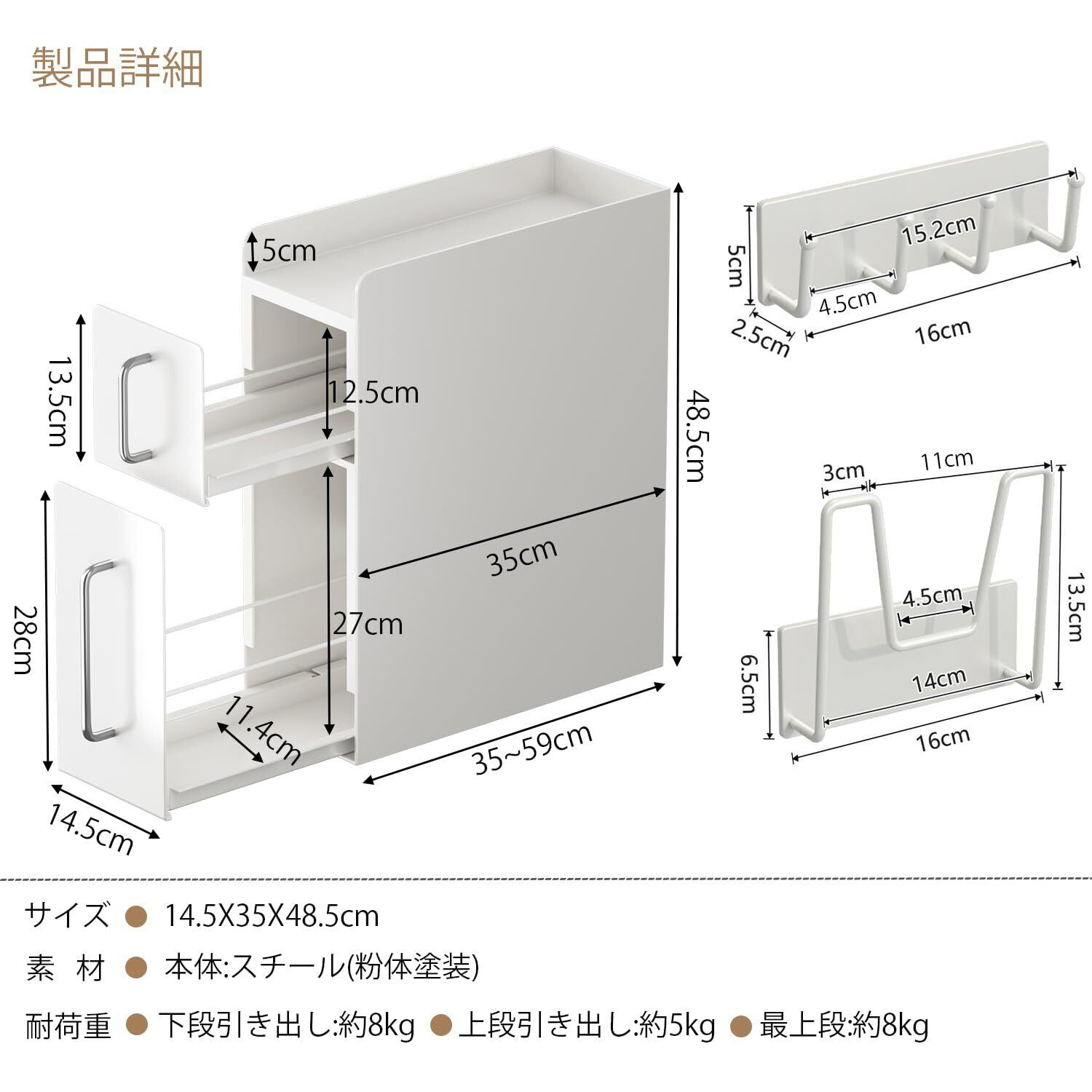 隠せる調味料ラック 2段 調味料ラック台所用 大容量 引き出し式 コンロ横 キッチンラック 調味料 スパイス ボトル 省スペース大型 キッチン収納 (ホワイト, 幅14.5X 奥行35X 高さ48.5cm)