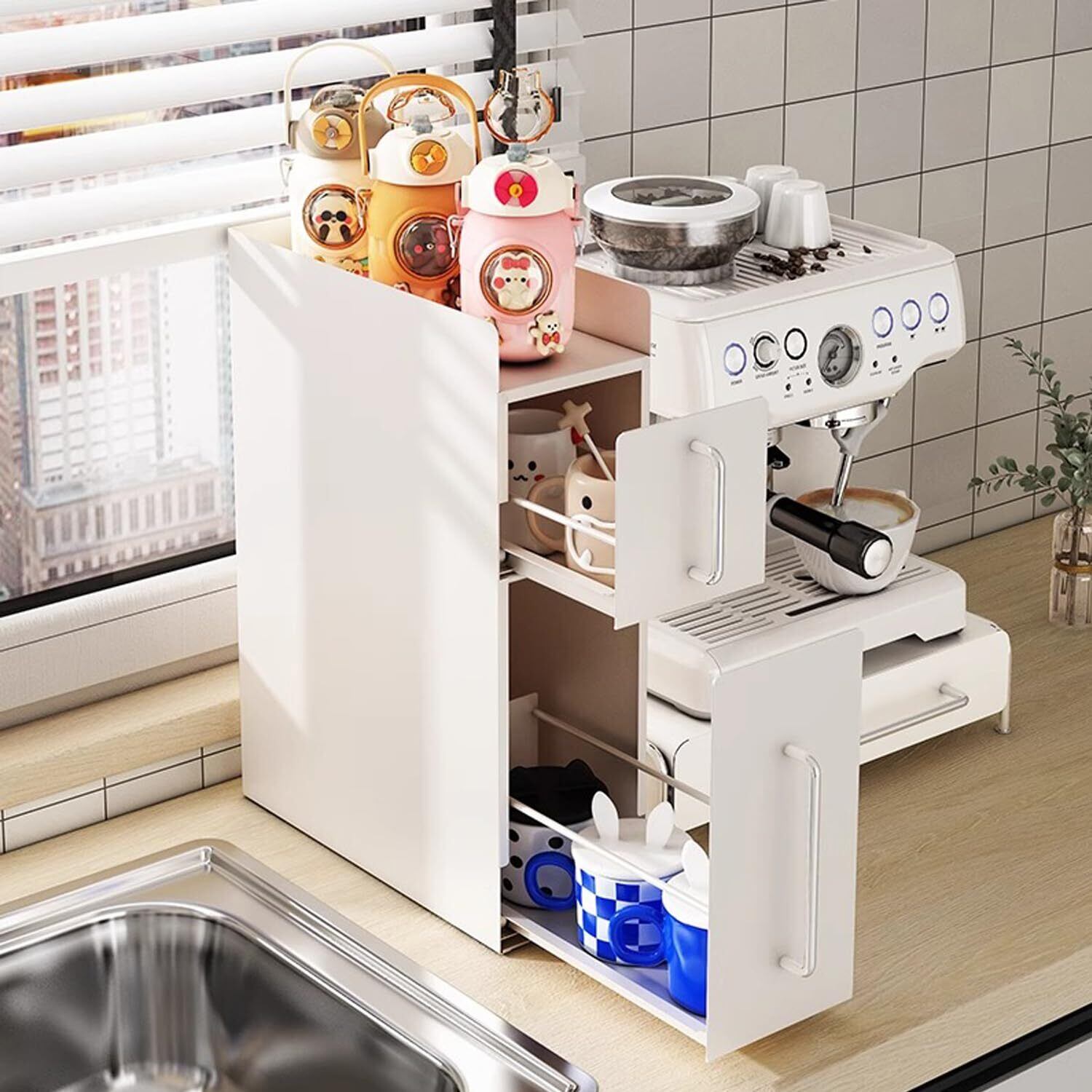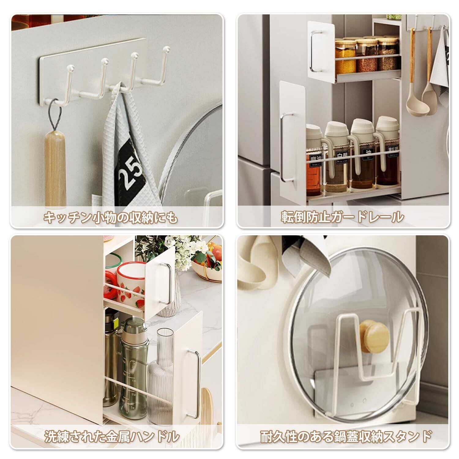【引き出し式デザイン】調味料棚はスライド式デザインなので、ものを取り出す時は軽く引き出すだけ、スムーズで滑らかです。引き出し部分は取り外し可能、内側の汚れを清潔しやすくなり、日々のお手入れがずっと楽になります。引き出しやすい細いシルバー取っ手。細くて、埃が溜まりにくい設計です。