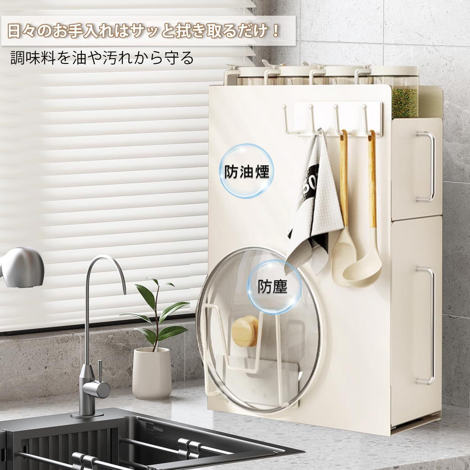 【隠せる調味料ラック】隠せる調味料ラックはスパイスの小瓶からお醤油や油類などを巧妙に隠して収納することができ、調味料ボトルを油跳ねから守り、コンロ回りを清潔に保ちます。奥行僅か14.5cmのスリムデザインは、コンロ横に設置すれば、空いたスペースを有効活用し、調味料が手頃で取り出しに便利です。