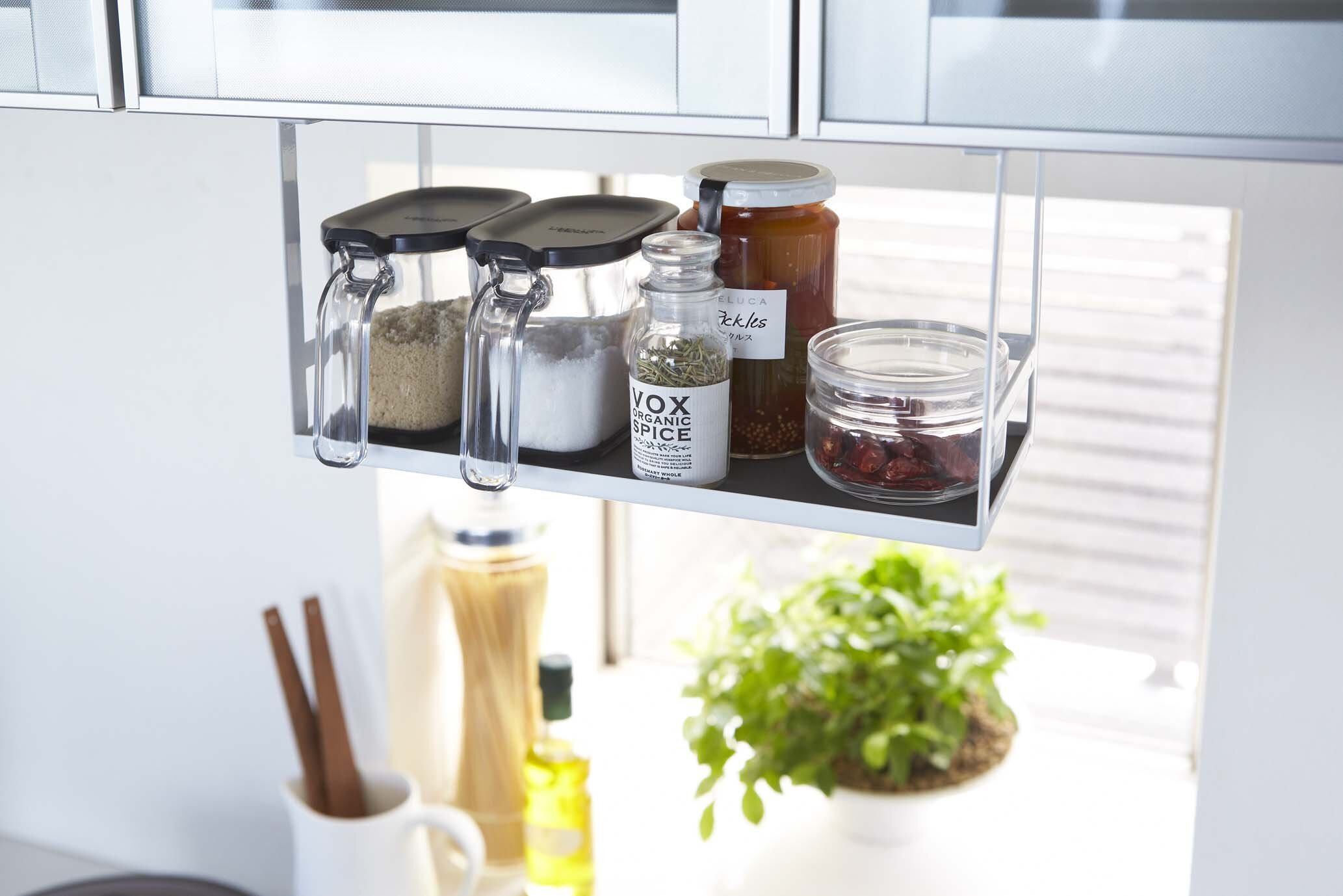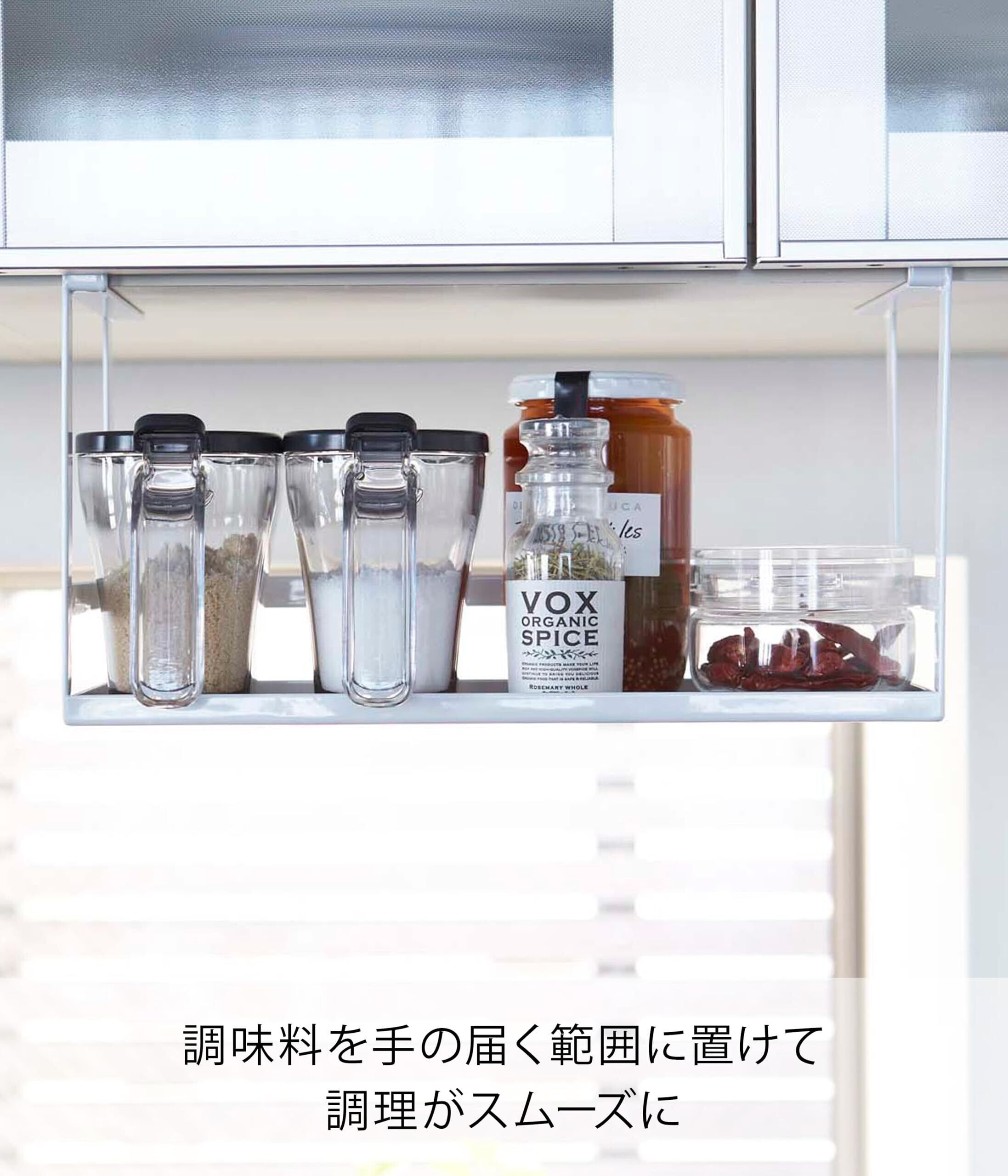 キッチン吊戸棚に取り付けるだけ。よく使う調味料やキャニスターなどのストックに便利。