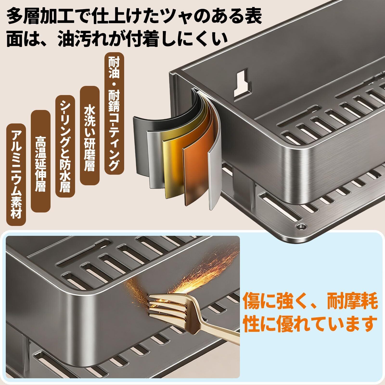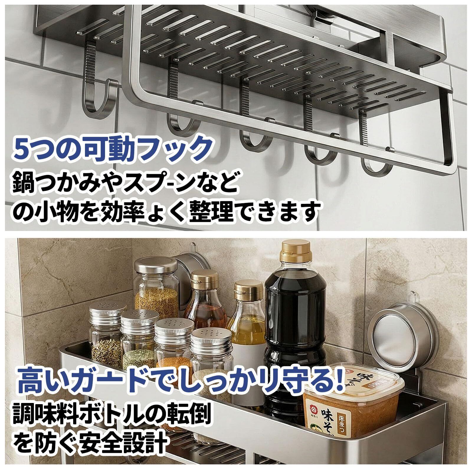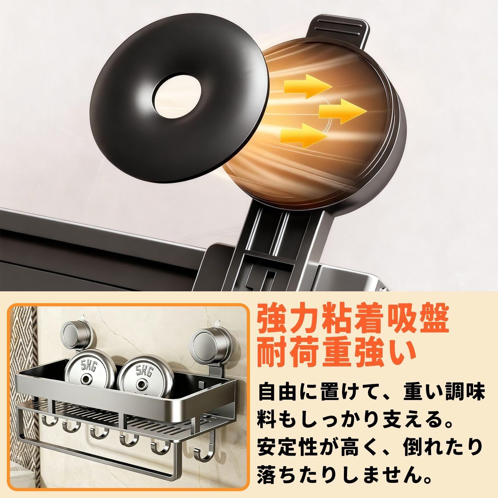 【強力吸盤&耐荷重強い】滑らかな壁面に強力に密着する「黏着+真空吸着式」設計!通常の吸着式よりも吸着力アップし、約7kgの積載力を実現した頑丈な構造です。調味料置き/キッチン収納ラックとして調味料ボトルやキッチンツールを安心して収納できますが、※滑らかな壁面での正しい取り付けを前提とさせていただきます)。