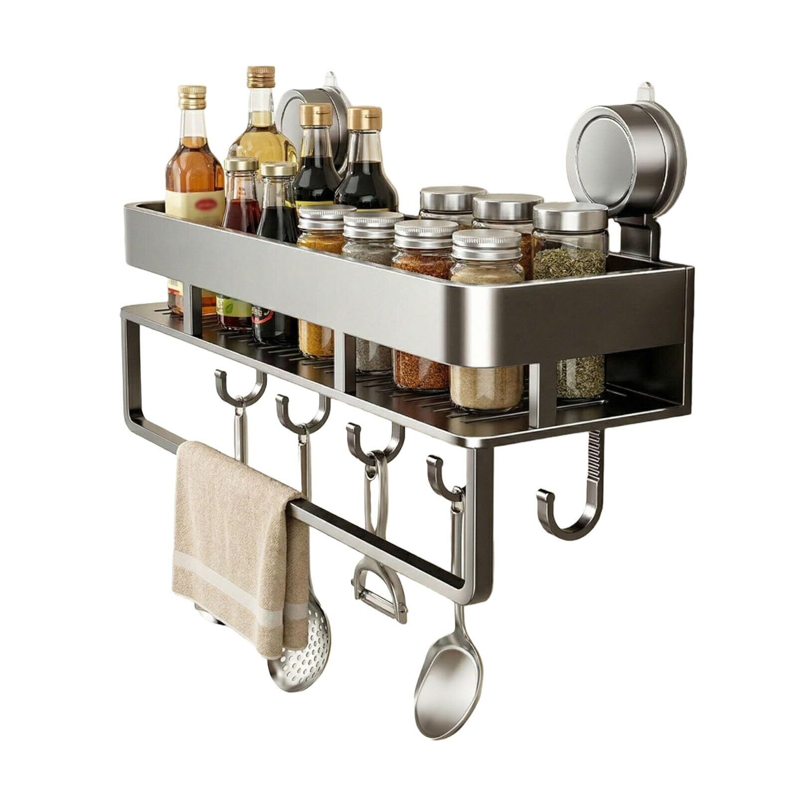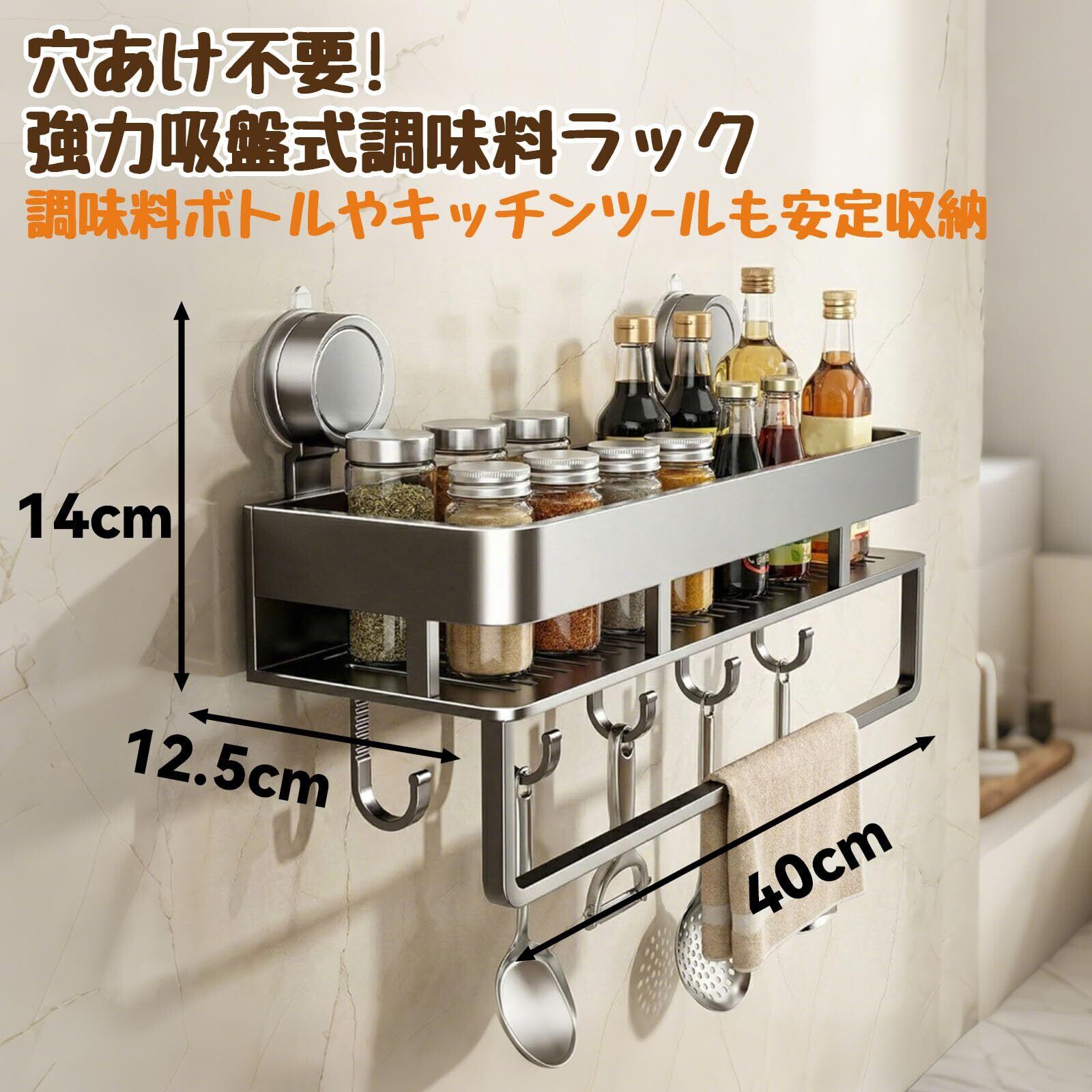 HOLEIMI調味料ラック 強力吸盤 スパイスラック 壁掛け キッチン収納ラック 調味料入れ 調味料置き 浮かせる収納 耐荷重5~7kg 防水防錆 ふきん掛け 5個移動式フック付き 穴あけ不要 壁掛け 布巾置き キッチン/風呂場/洗面所 40cm (グレー)