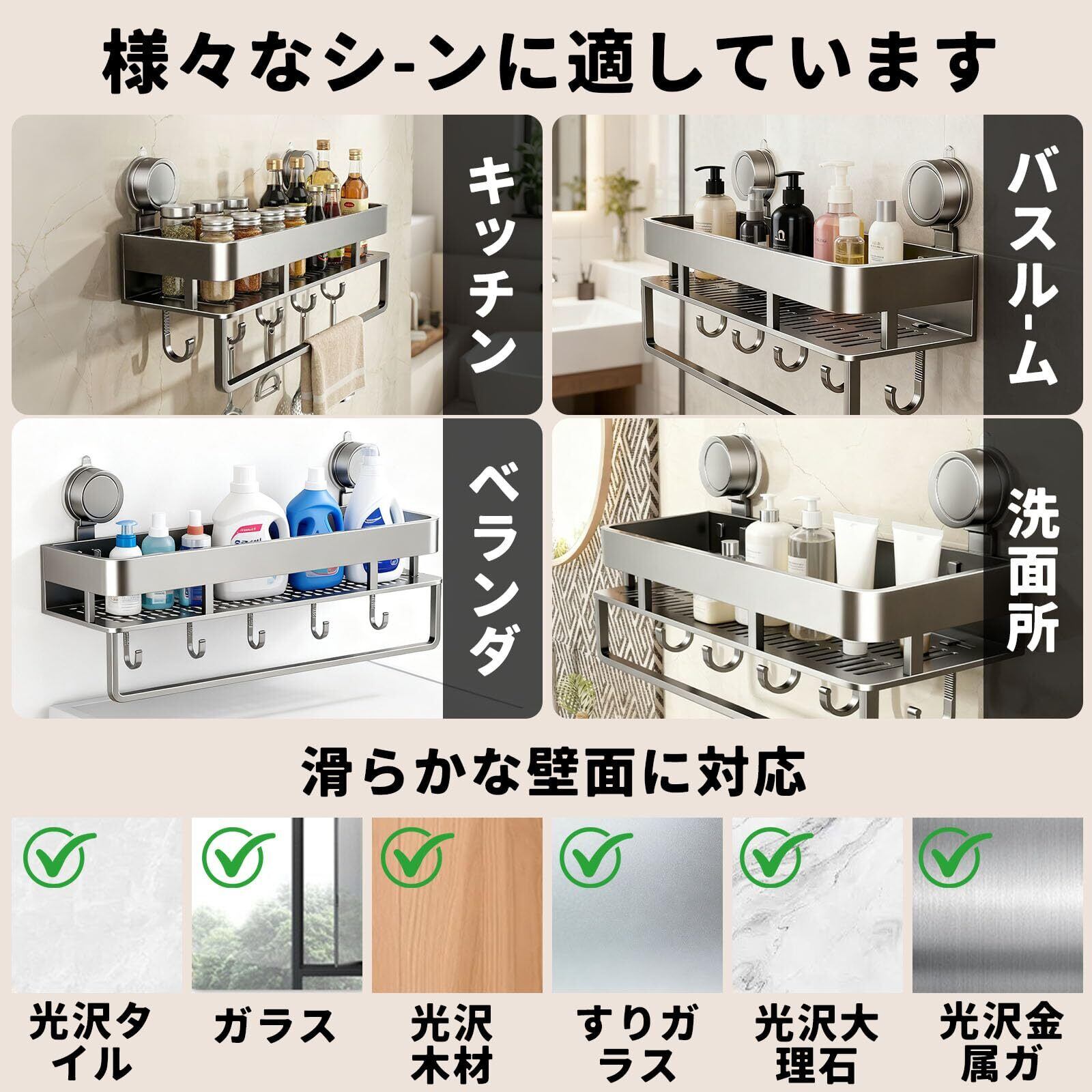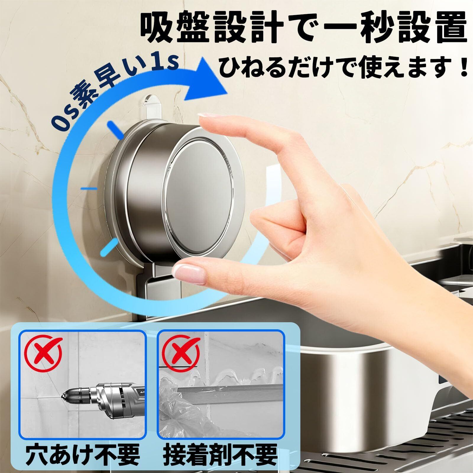 【面倒な穴あけ工事は一切不要】吸盤を押し付けるだけで、たった数秒で簡単取り付け。賃貸住宅でも、タイル張りのキッチンや浴室でも、壁を傷つけることなく理想の収納スペースが完成します。