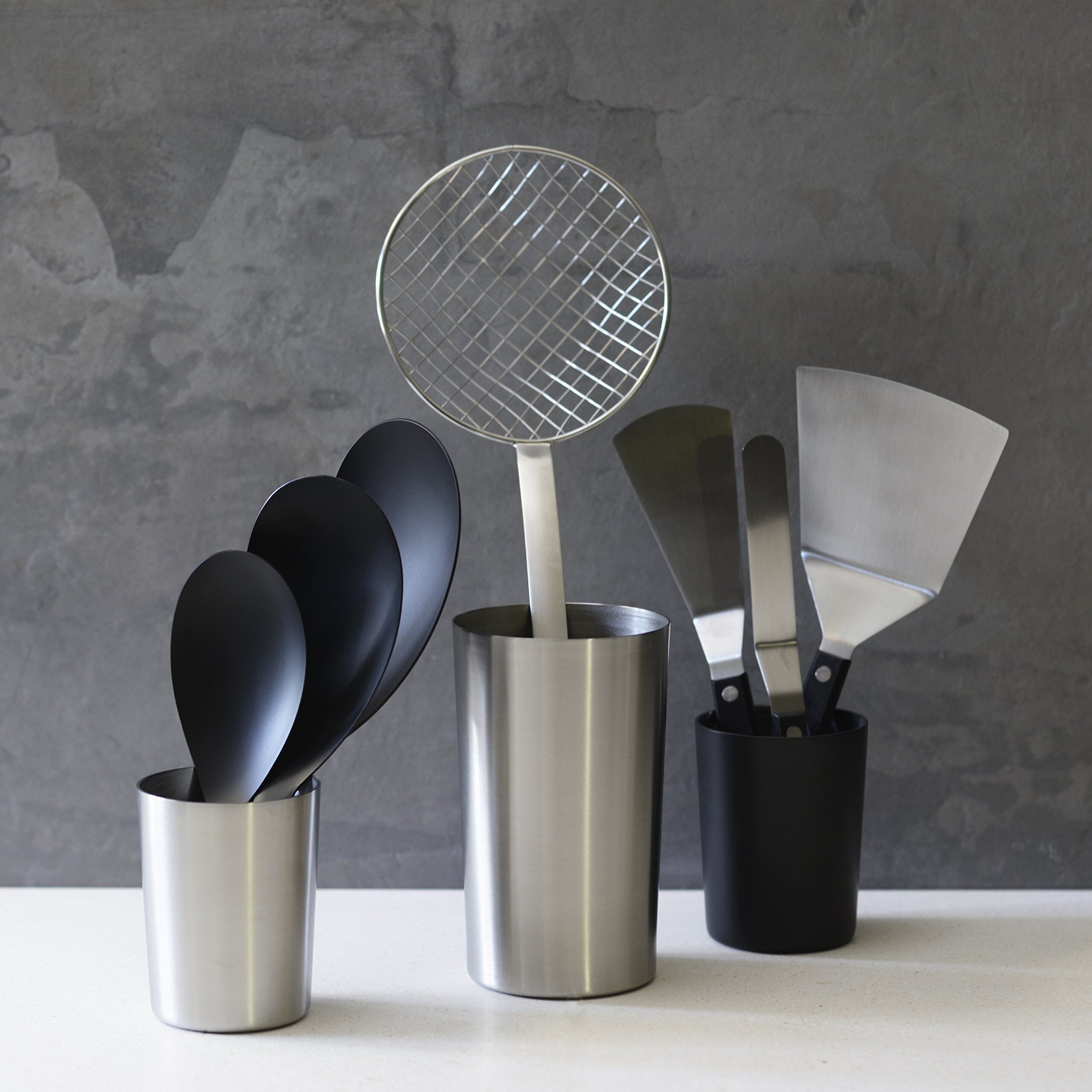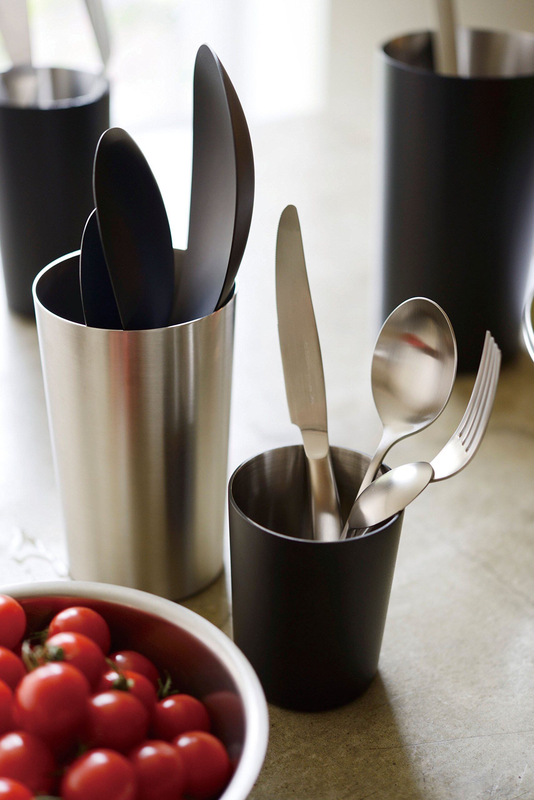 小サイズはカトラリーの収納に便利です。 今まで引き出しに収納していたティースプーンやフルーツフォークなどを、このツールスタンド(小)に収納してみてください。その収納力に驚くはずです。引き出しの中を探すことがなくなるでしょう。 表面がマットな艶消し仕上げでかっこいいステンレス製品なので、デスク上のペン立て、ドレッサー前のメイクブラシ入れなどキッチン以外でも使ってみてください。 たくさんのスプーンやフォークを入れても、板厚で安定しており倒れにくい設計です。絞り加工によって一体形成しているので、一生ものといって良いほど長持ちします。