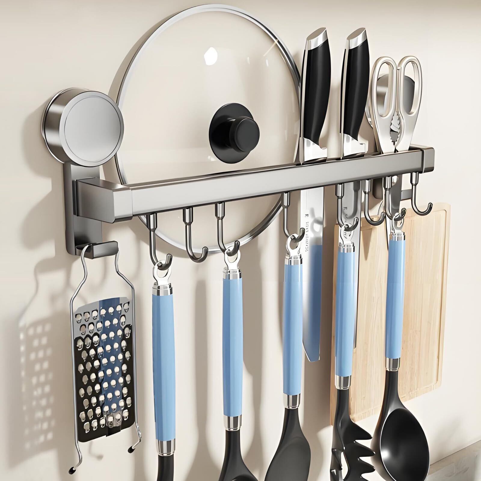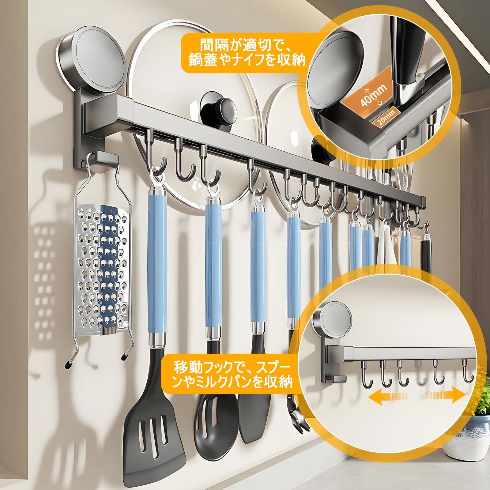 Lyzone キッチンツールフック アルミニウム 吸盤 キッチンラック 強力粘着 軽量 防水防錆 調理器具 鍋蓋置き 穴あけ不要 壁掛け 台所収納 強い収納力 可動式 簡単取付 (40cm 8個フック)