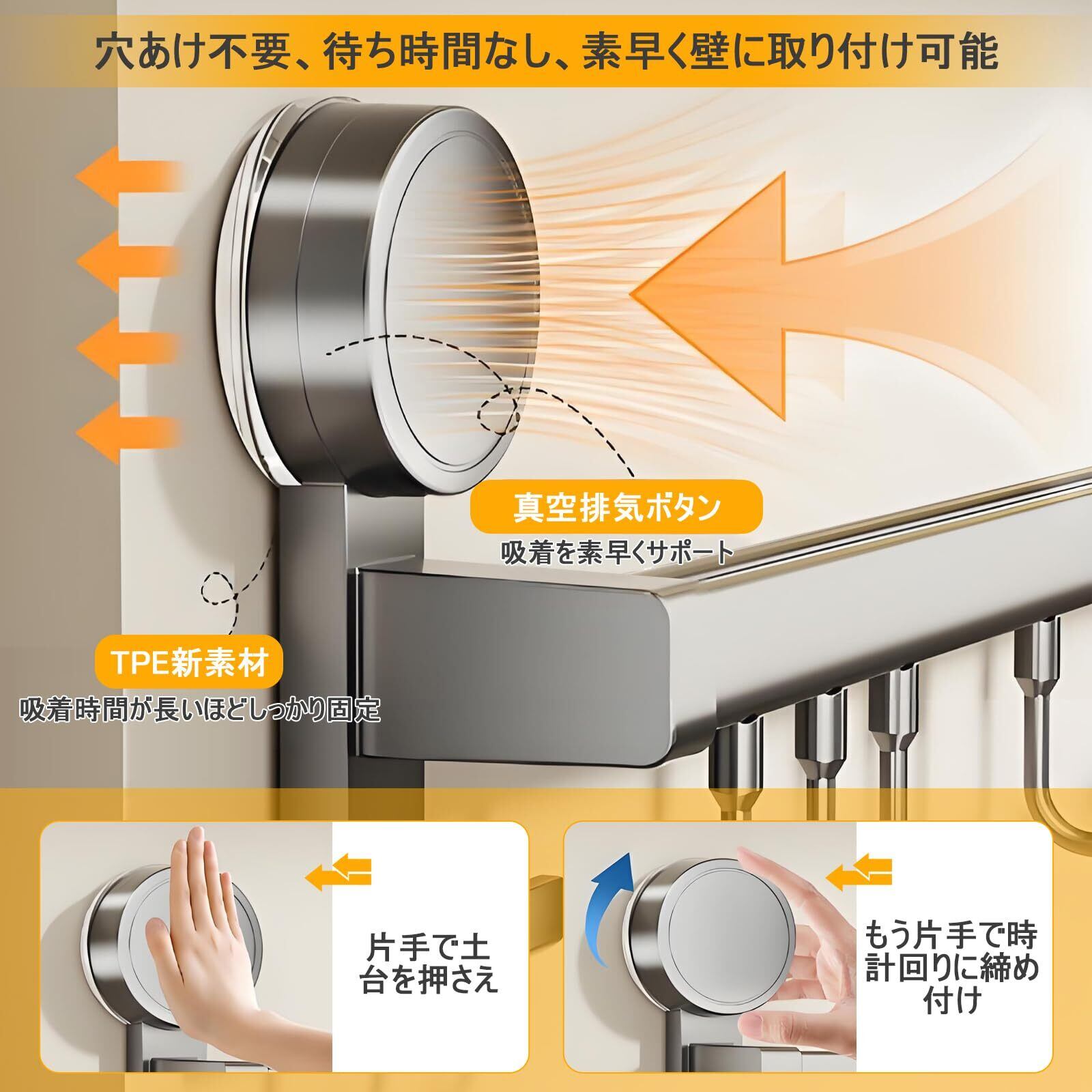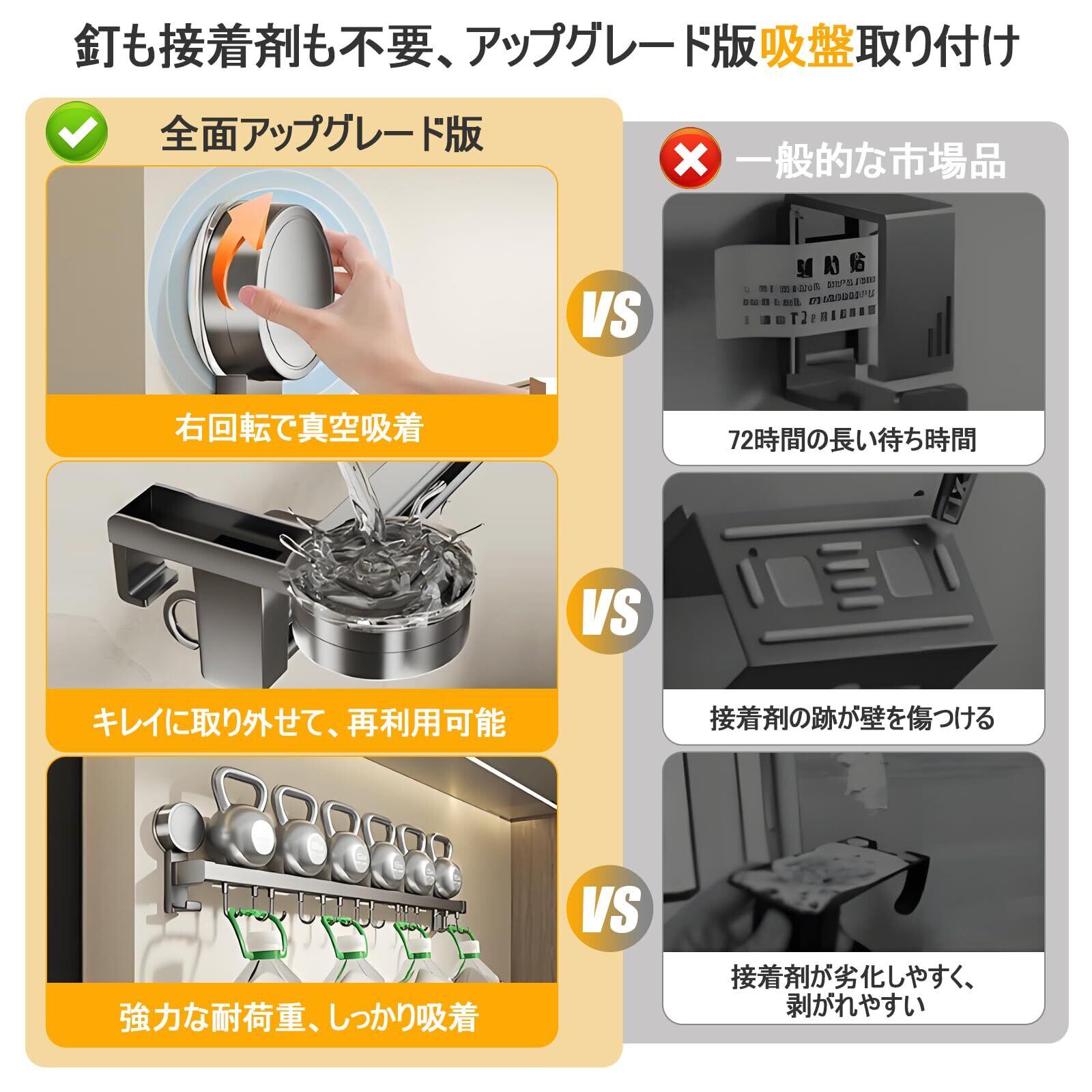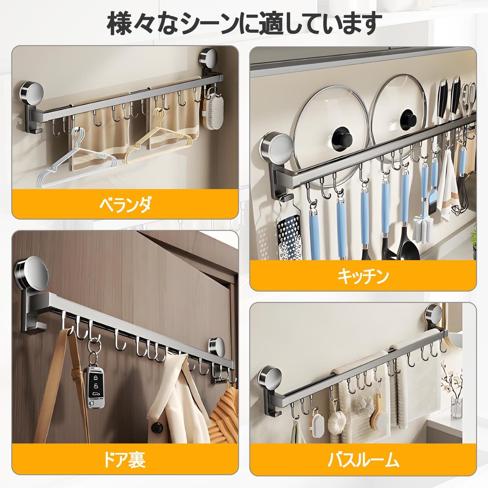 【超強耐荷重+幅広い用途】このキッチンツールフックは、強力な真空吸盤で最大10kgの耐荷重を実現。正しく取り付ければ、タオルやフライパンなど軽いものから重いものまでしっかりと掛けられます。キッチンだけでなく、バスルーム、玄関、ベランダなど、日常生活のさまざまなシーンで活躍します。