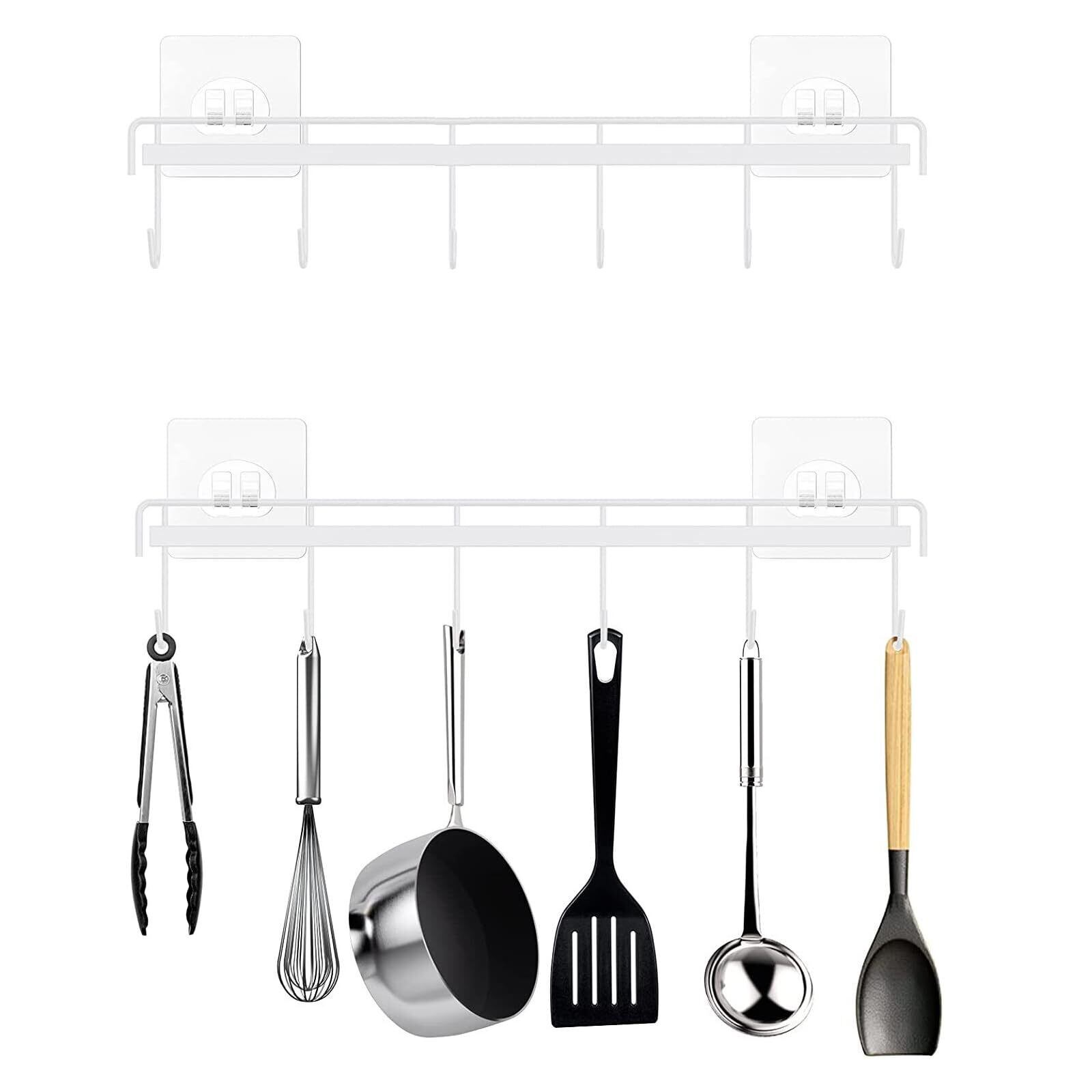 【キッチンツールフック】サイズ:32.5 x 6.5 x 2 cm、重量:約112 g、材質:鉄、数量:キッチンツールフック1個、粘着フック2個。 この壁掛けフックで収納スペースを節約できます。 各棚には6つのフックがあり、キッチンツールを掛けられます。